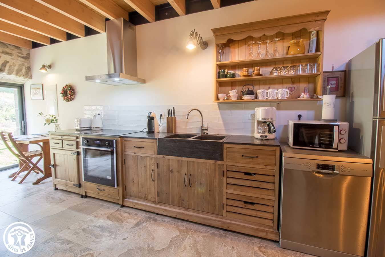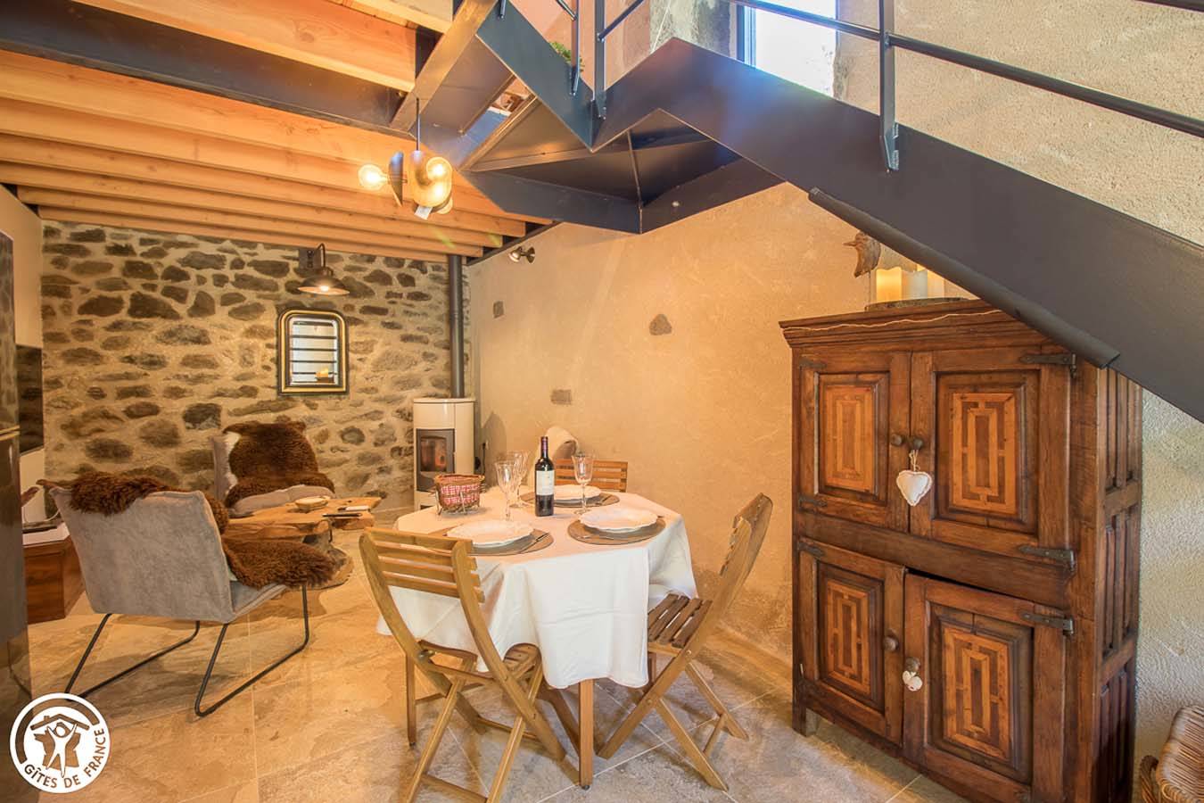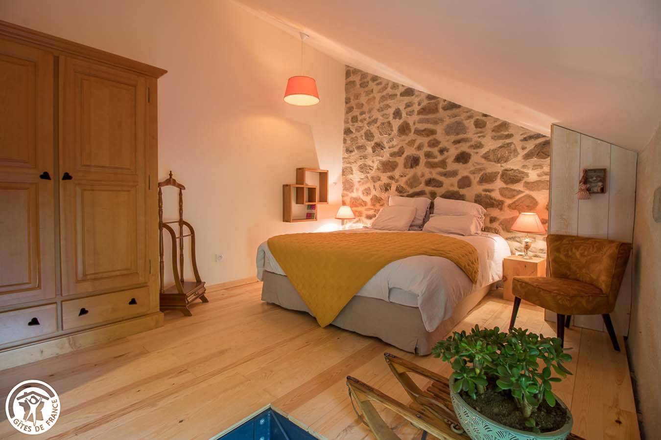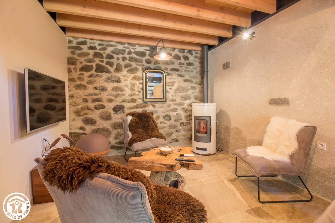 Vous serez enchantés par l’ambiance chaleureuse et cosy de ce gîte en pierres. Tout ici a été pensé pour votre confort, qualité des matériaux : bois et pierre, mobilier, équipements… sans oublier le poêle à granulés pour une chaleur diffuse. Point fort : accès à l’étang des propriétaires qui se trouve juste au-dessus. Vous profiterez d’un espace avec salon de détente, barbecue, salon de jardin.