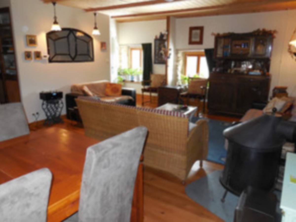 Voici le deuxième salon avec cuisine ouverte 5 x 9 mètres. Avec les planchers de bois chaleureux, les plafonds, les murs et ajourées cheminée de galets peut aussi imaginer dans ce domaine au Moyen Age.