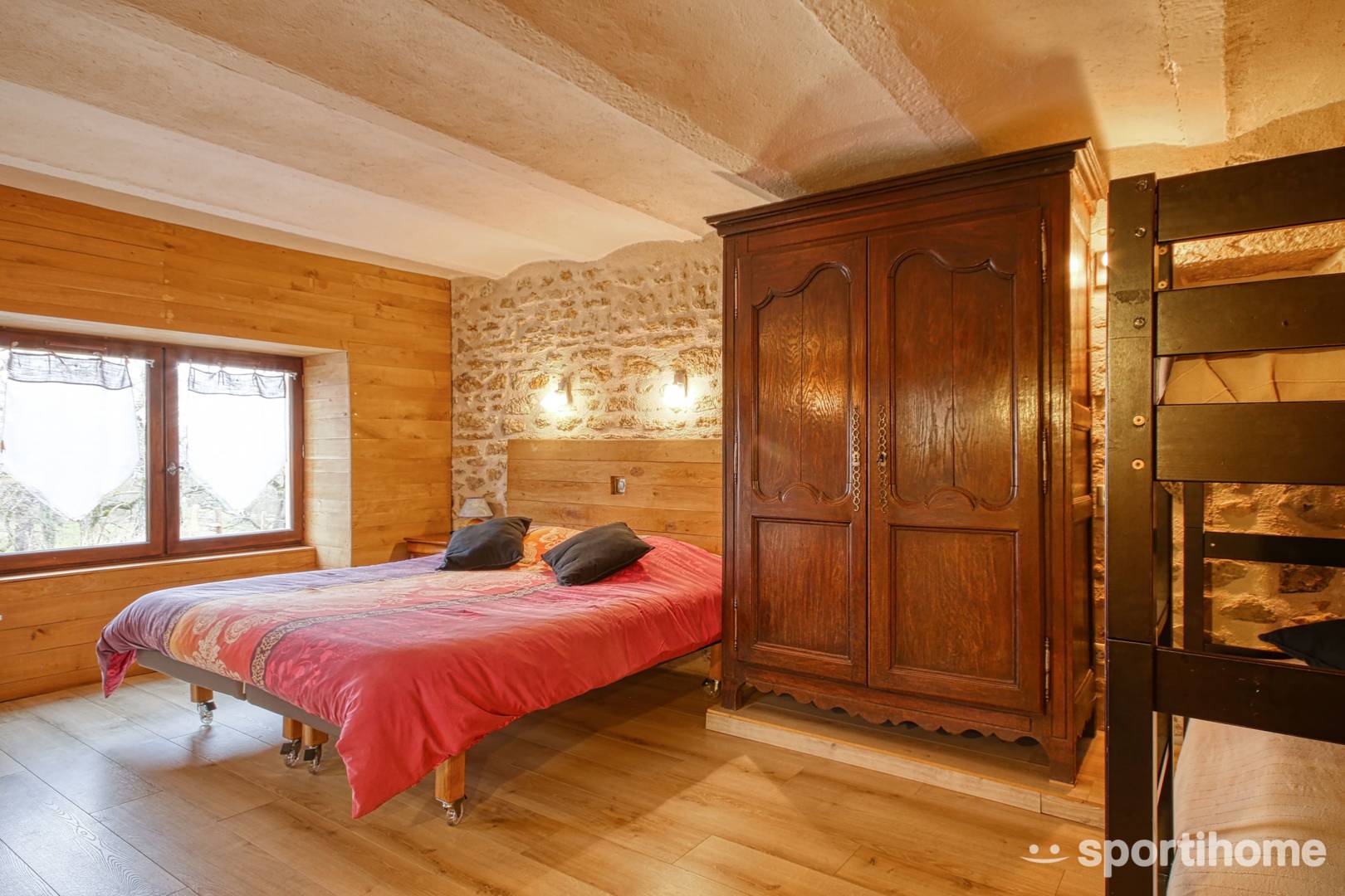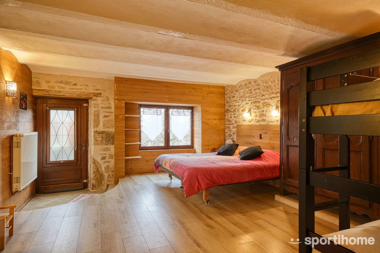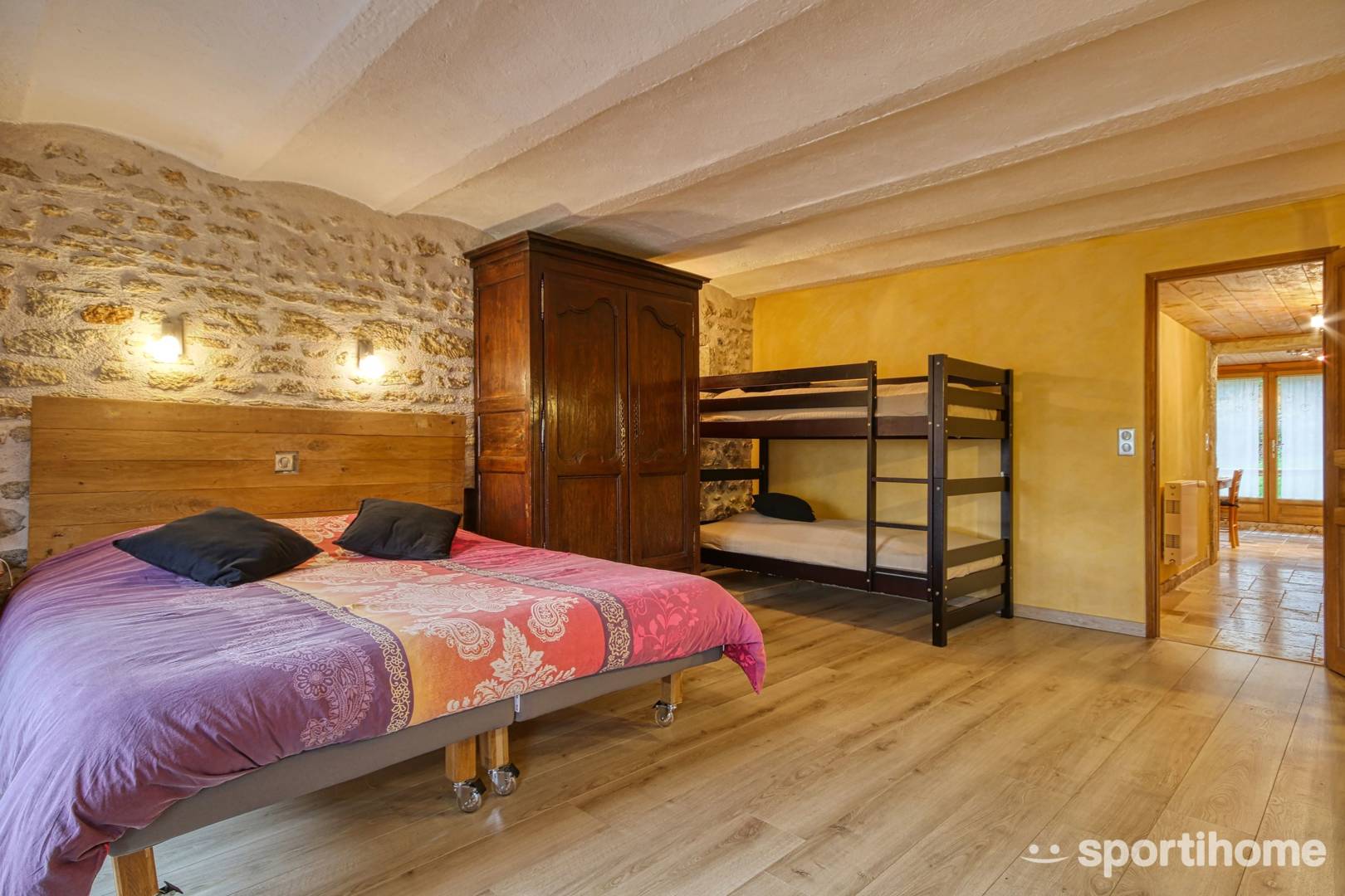 – une chambre avec 4 couchages (2 lits superposés (90 cm) + soit 2 lits simples (90 cm) soit 1 lit de 180cm)