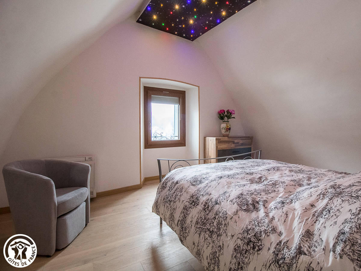 A l’étage, une vaste chambre (pas de porte) avec un lit 160 grand confort et ciel étoilé.