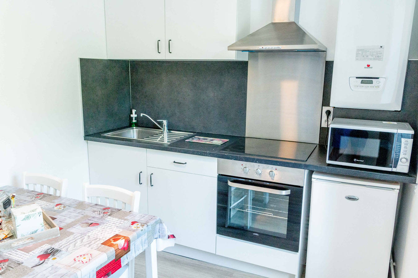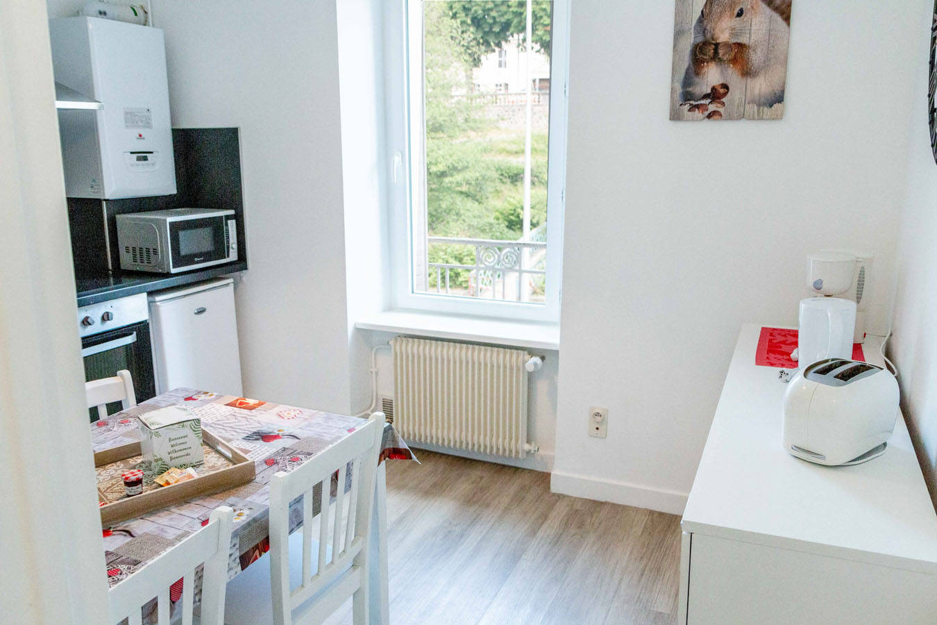 Appartement au 1er étage d’un petit immeuble avec parking privé et espace vert. Isolation. Double vitrage. TV TNT. Séjour avec canapé. Cuisine américaine. Chambre côté sud, salle de bain et WC séparés