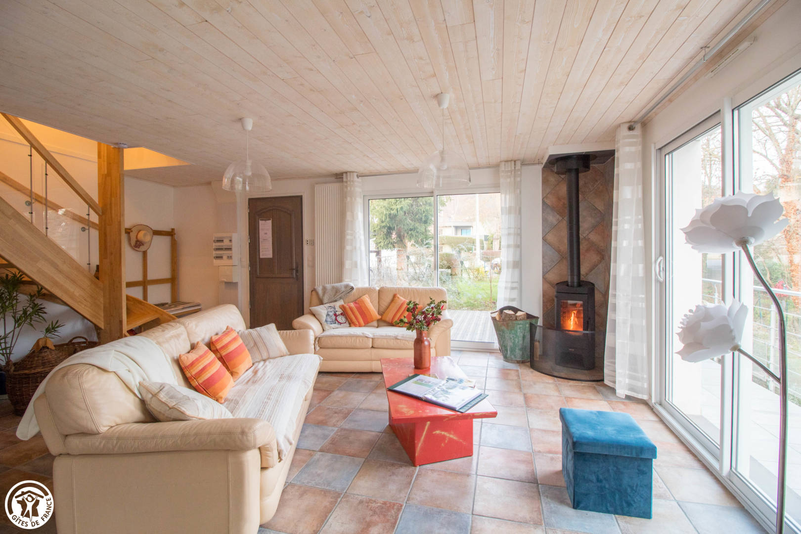 au rez de chaussé, une vaste pièce à vivre (40 m²) comprenant un salon avec poêle, une cuisine aménagée ouverte, ainsi que lingerie, toilettes, balcon et terrasse.