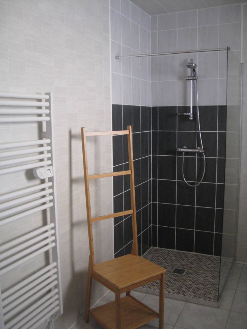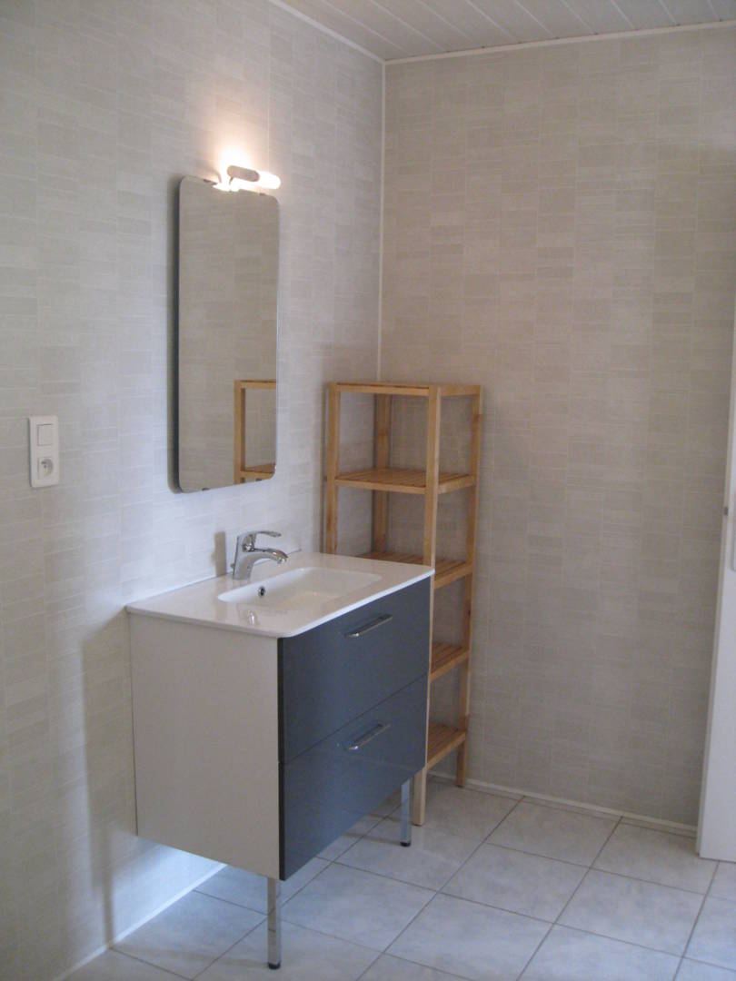 A l’étage : 1 chambre (1 lit 140 cm), 1 chambre (3 lits 80×200 cm dont 1 lit gigogne) et une salle de bain(douche à l’italienne, vasque, WC)