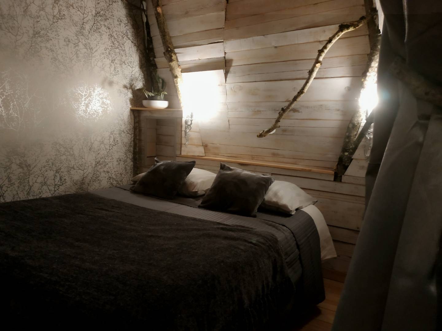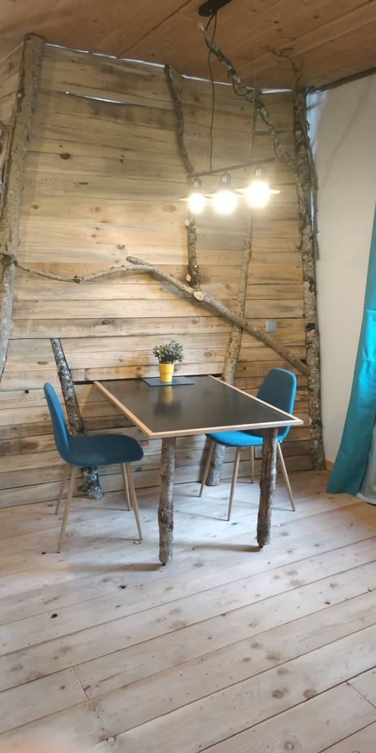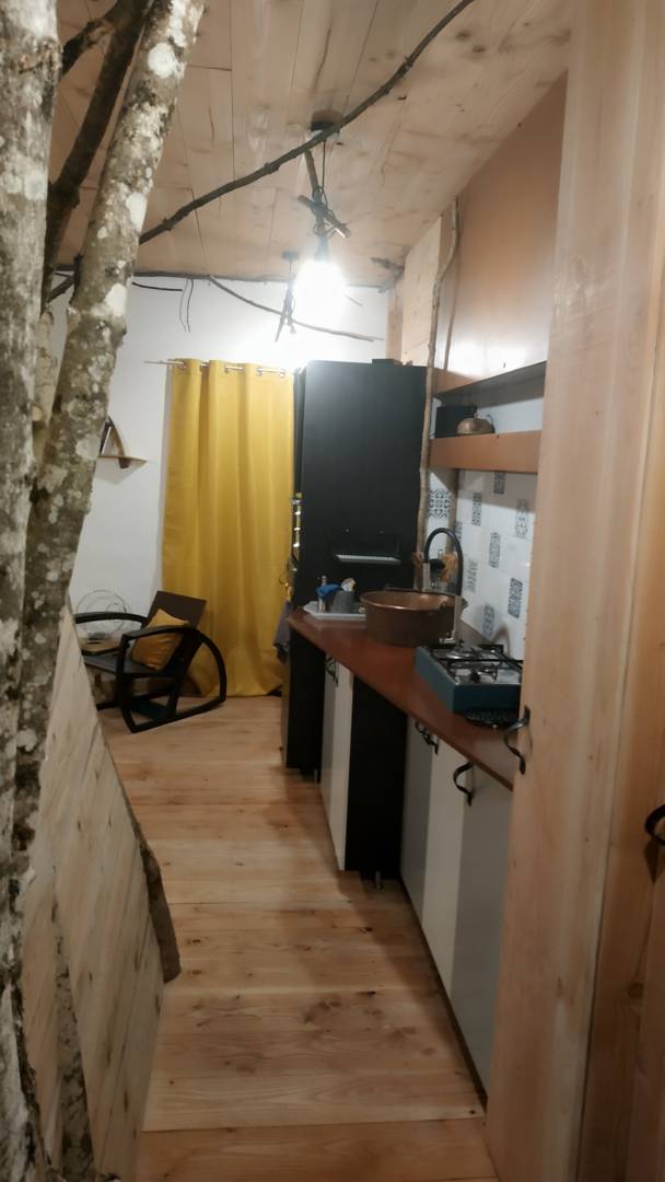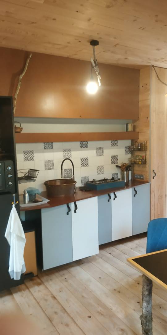 L’esprit du gite est entre la micro maison et la cabane intérieure. La petite surface a été optimisée pour installer une chambre avec un lit 140*190, et une pièce à vivre réunissant un coin cuisine, salon et espace pour manger.