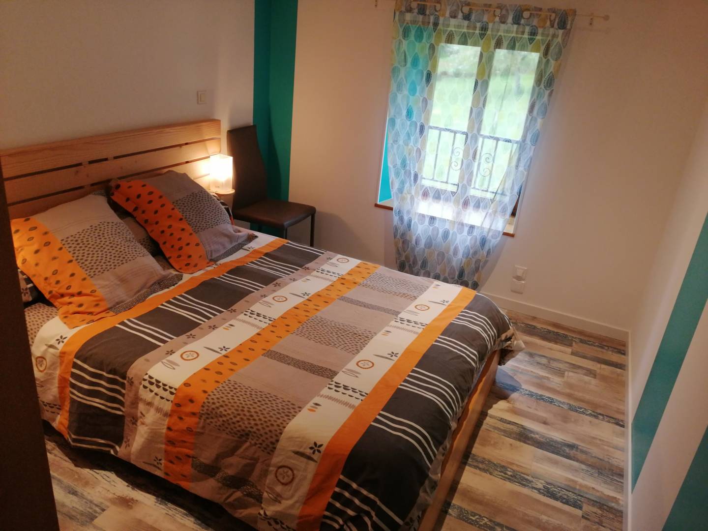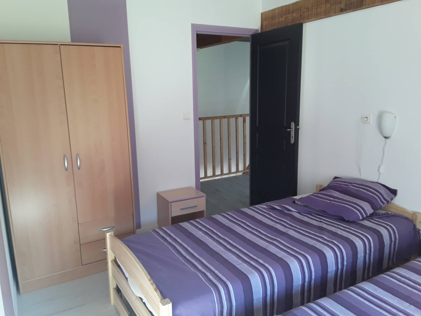 A l’étage : 1 chambre (1 lit 140×190), 1 chambre 2 lits (90×200); partie refaite à neuf en 2021, 1 salle d’eau (douche à l’italienne (2023), vasque, WC. Terrasse couverte soleil couchant (avec mobilier de jardin).