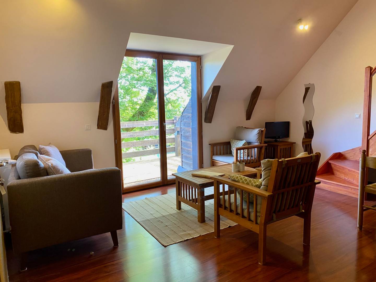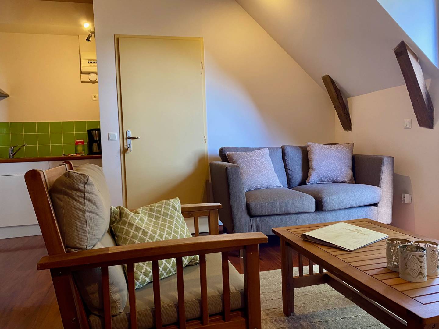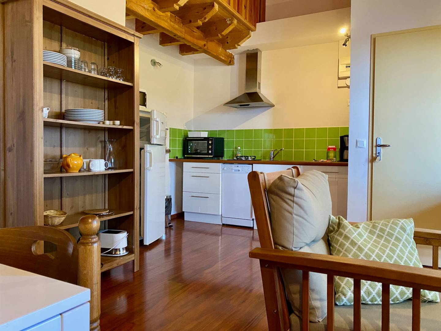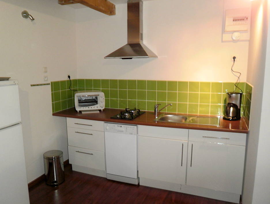 La cuisine ouverte équipée offre tout le confort. Dans une ancienne grange de 1890, 5 appartements meublés et très confortables (classés ***) sont à louer toute l’année. Ils sont tous situés au premier étage, sous la toiture, au-dessus de la vieille étable qui a été transformée en salle de loisirs.(…)