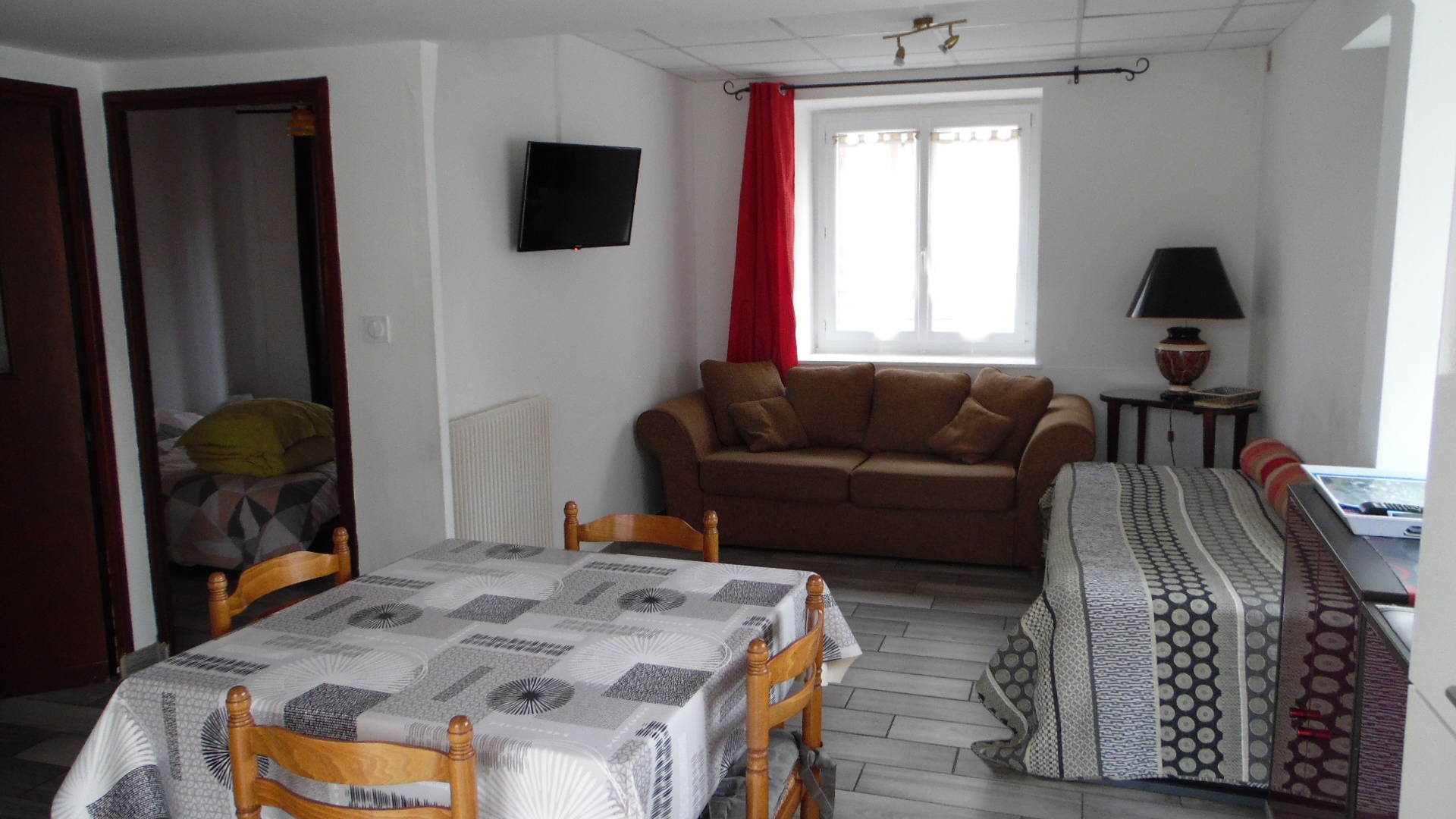 Console avec lampe ; Télévision écran plat mural ; Divan 3 places ; Lits gigognes en 90