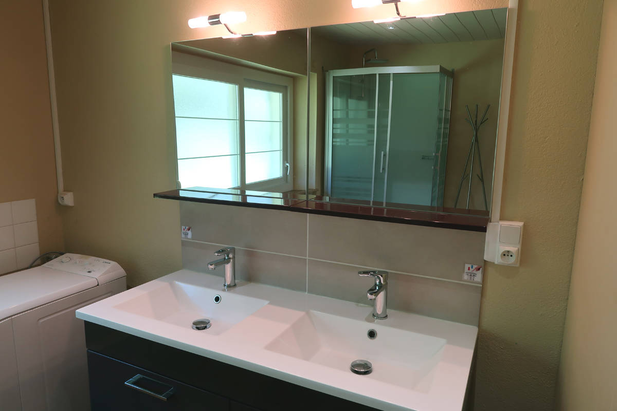 -Salle de bain lumineuse de 11 m² avec douche, double vasque et lave-linge.