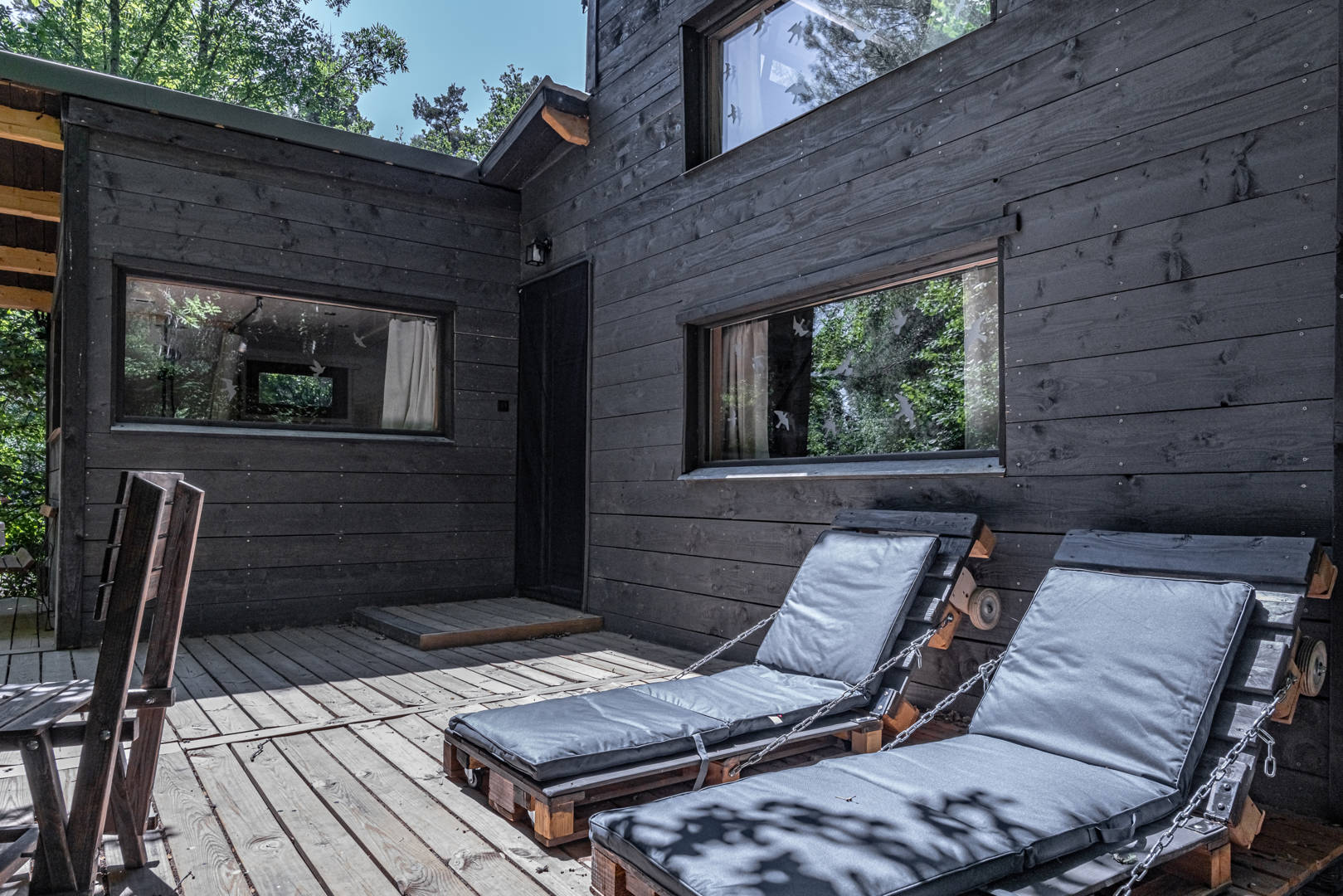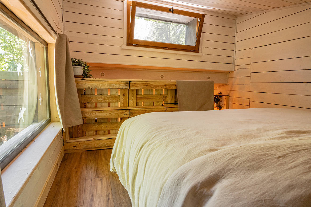 La chambre se situe, quant à elle, sur la mezzanine au-dessus du salon, elle possède une grande baie vitrée et une fenêtre (abattant) donnant sur les arbres, le lit fait 180x200cm.