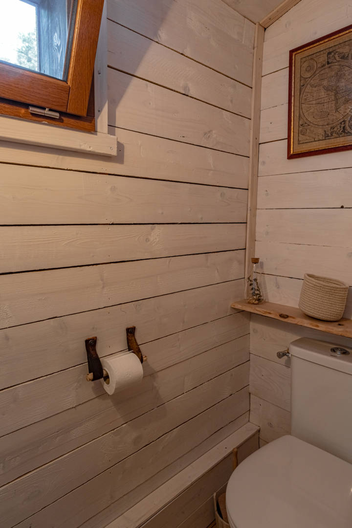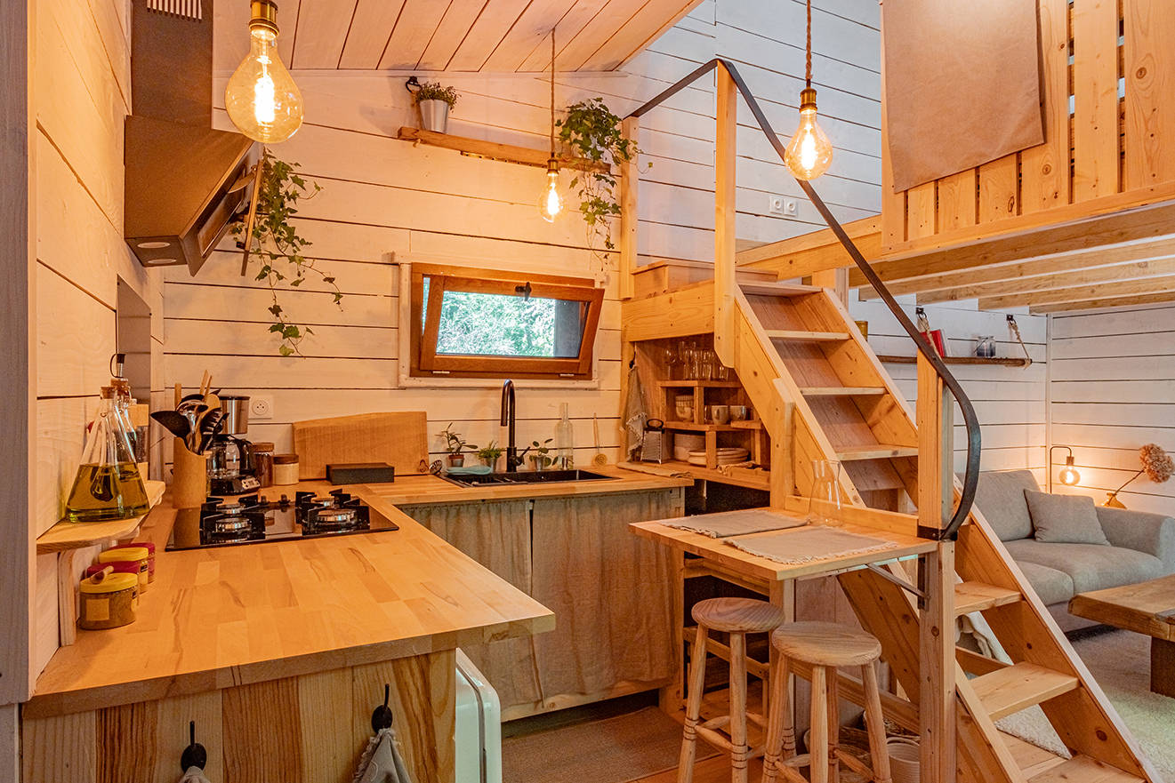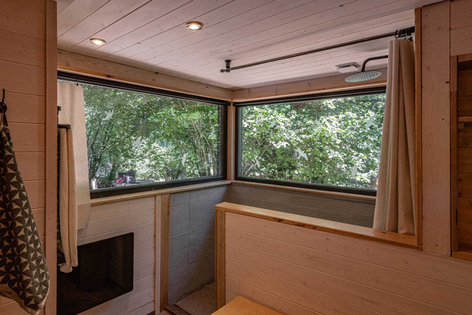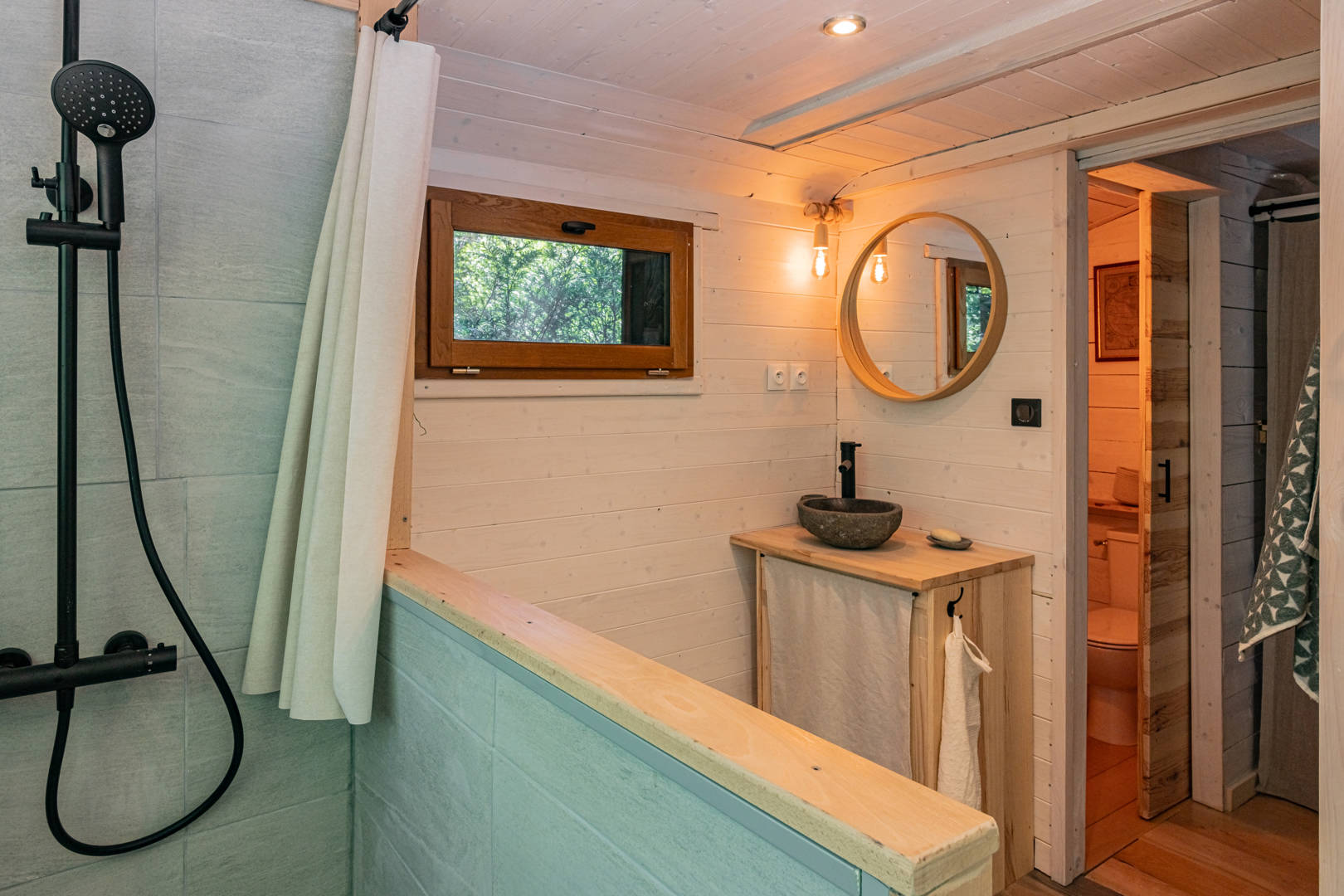 Le rez-de-chaussée comprend une cuisine, un salon, un WC indépendant et une salle de bain avec douche “ouverte” sur l’extérieur.
