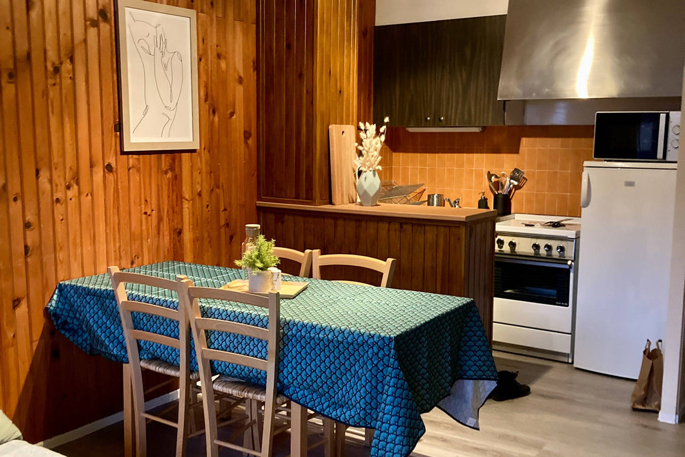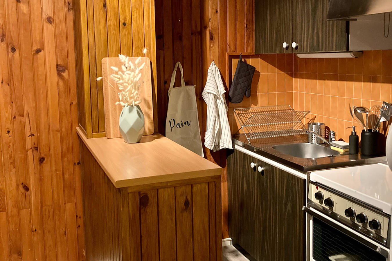 – d’une cuisine ouverte sur le séjour, avec évier, frigo, plaques, four, micro-onde, machine à café, bouilloire, grille-pain, appareil à raclette, et de tout ce dont vous aurez besoin pour vous préparer de bons petits plats.