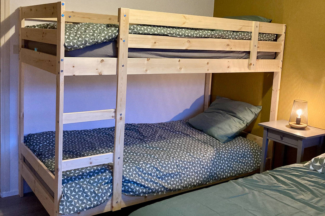– d’une chambre, avec un lit double de 140cm et un lit superposé pouvant accueillir deux autres personnes. La chambre dispose d’une penderie pour y ranger vos affaires.