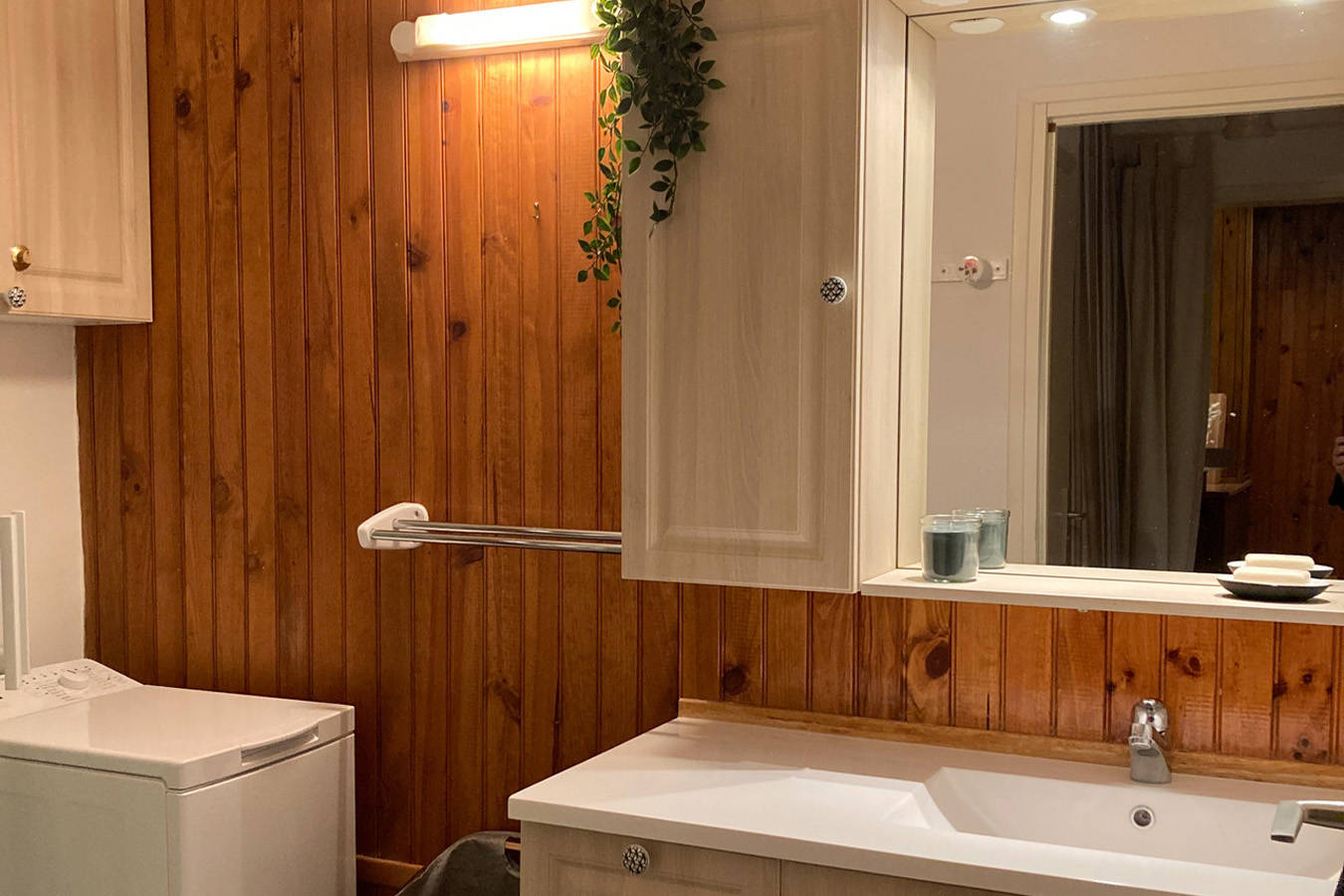 – d’une salle de bain avec meuble vasque, machine à laver et douche.