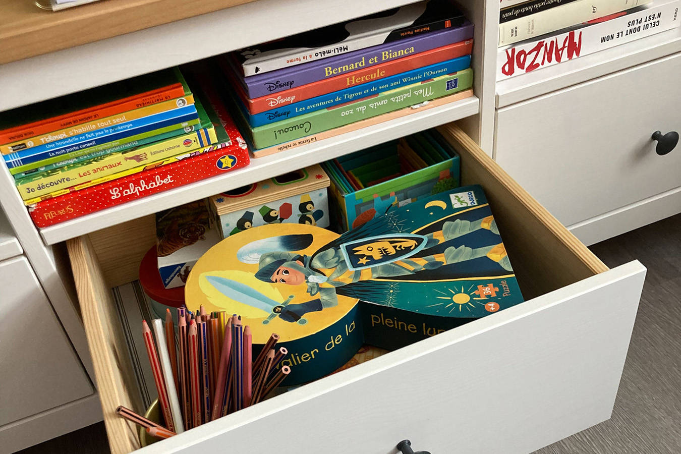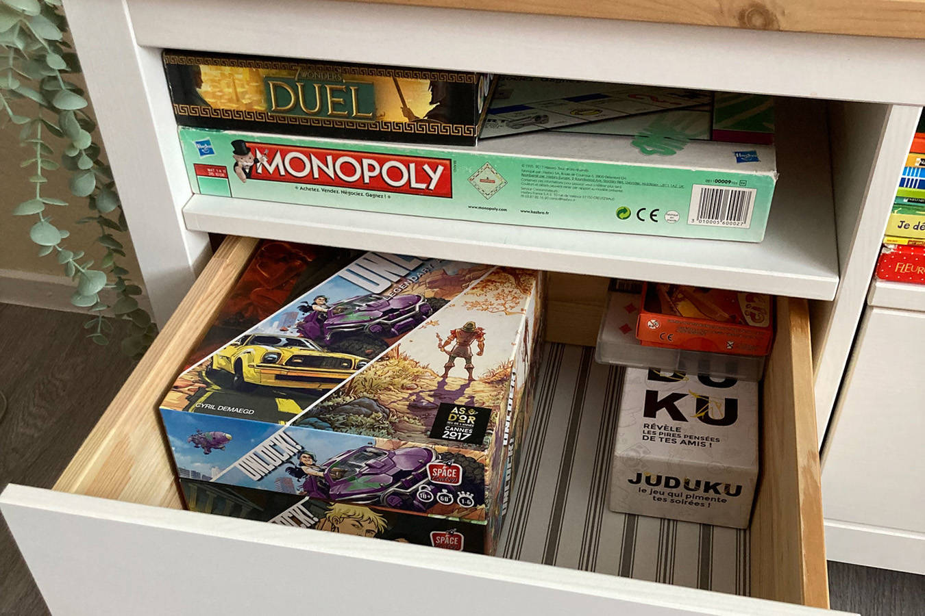 Enfants : réhausseur, barrière de lit, jeux de société, livres, coloriages et crayons de couleur.
