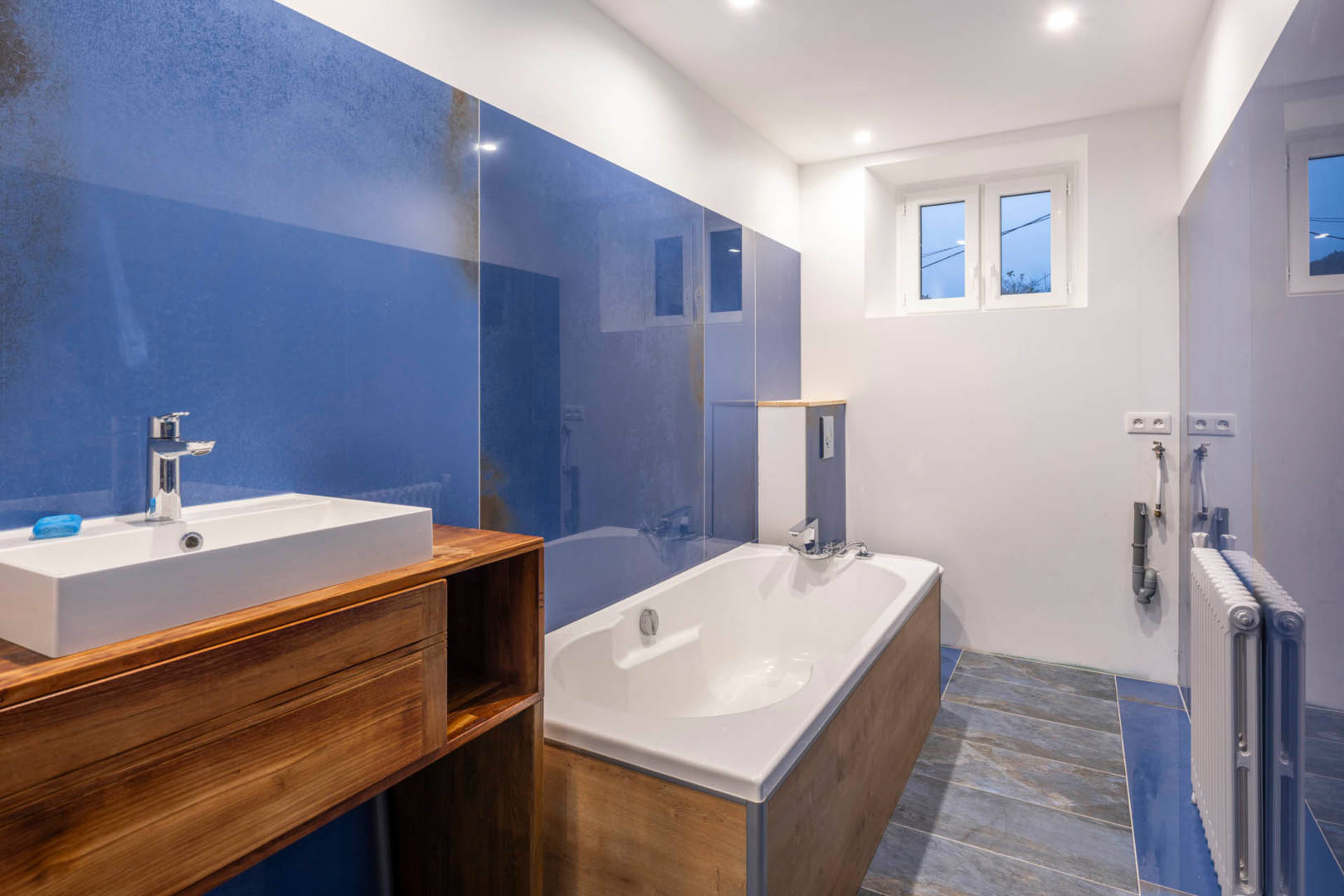 – Une salle de bain avec baignoire et WC.