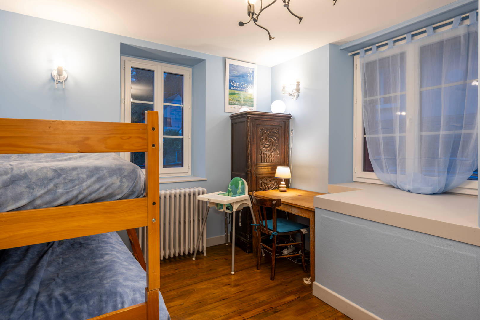 – Chambre bleue : deux lits simples superposés (2 couchages)