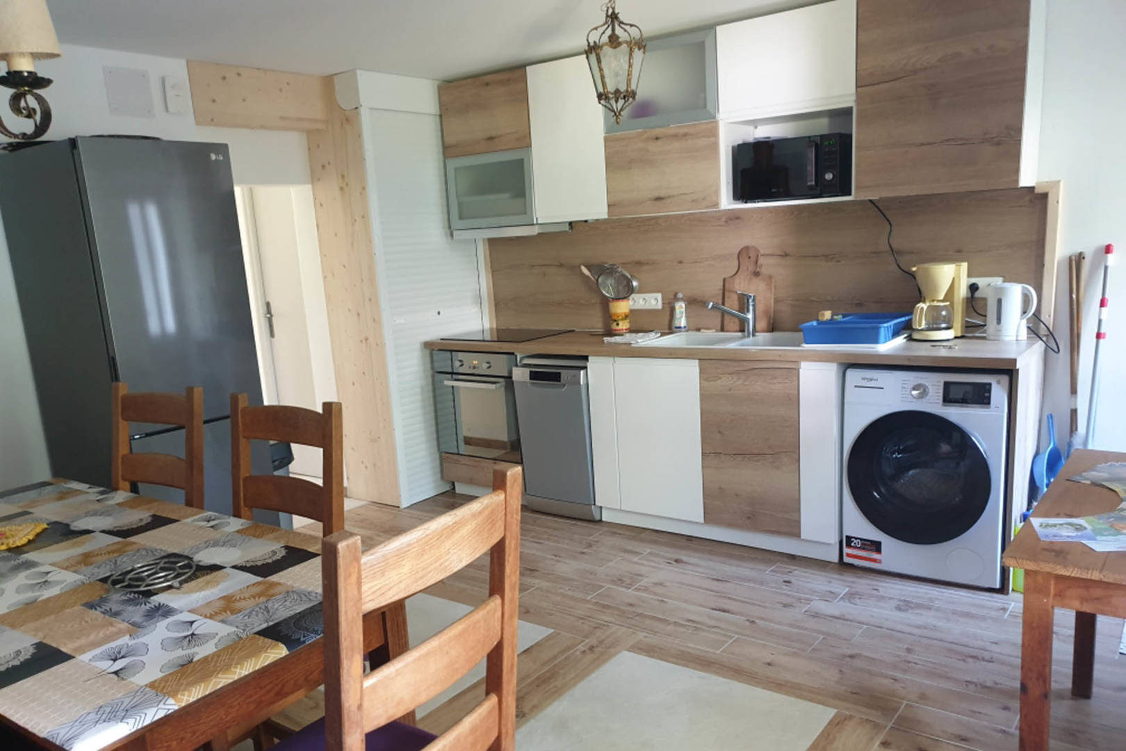– Une cuisine équipée avec notamment : bouilloire électrique, four, four à micro-ondes, grille-pain, lave-vaisselle, plaques de cuisson à induction…