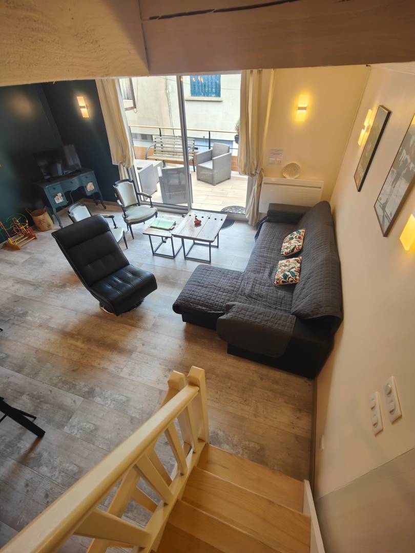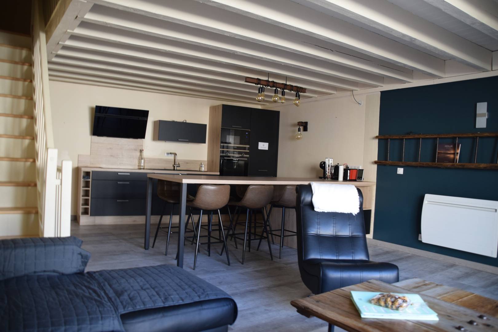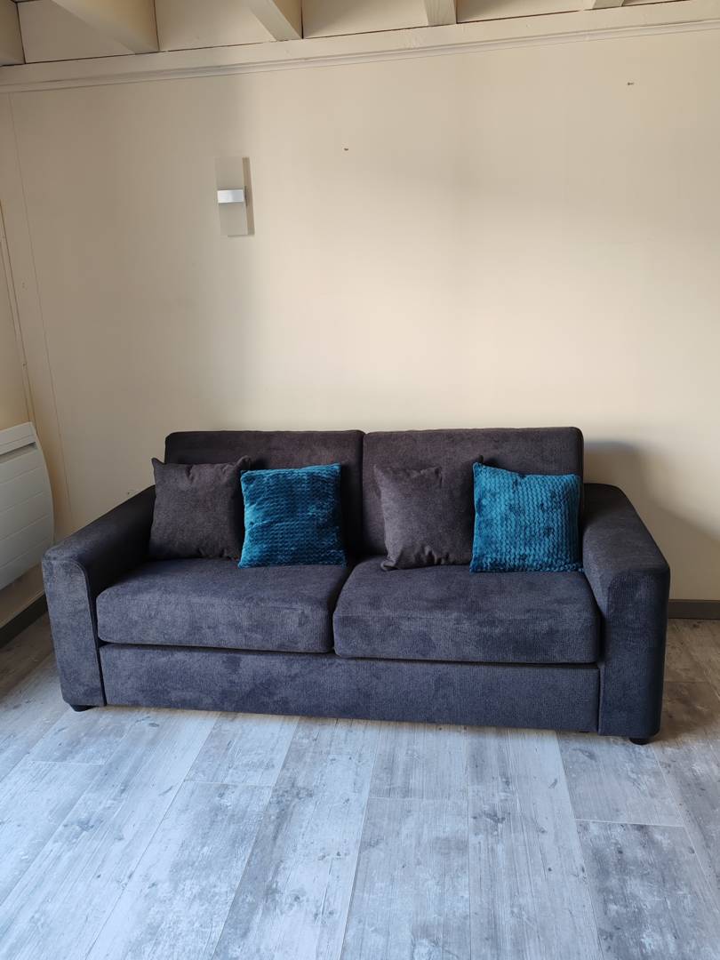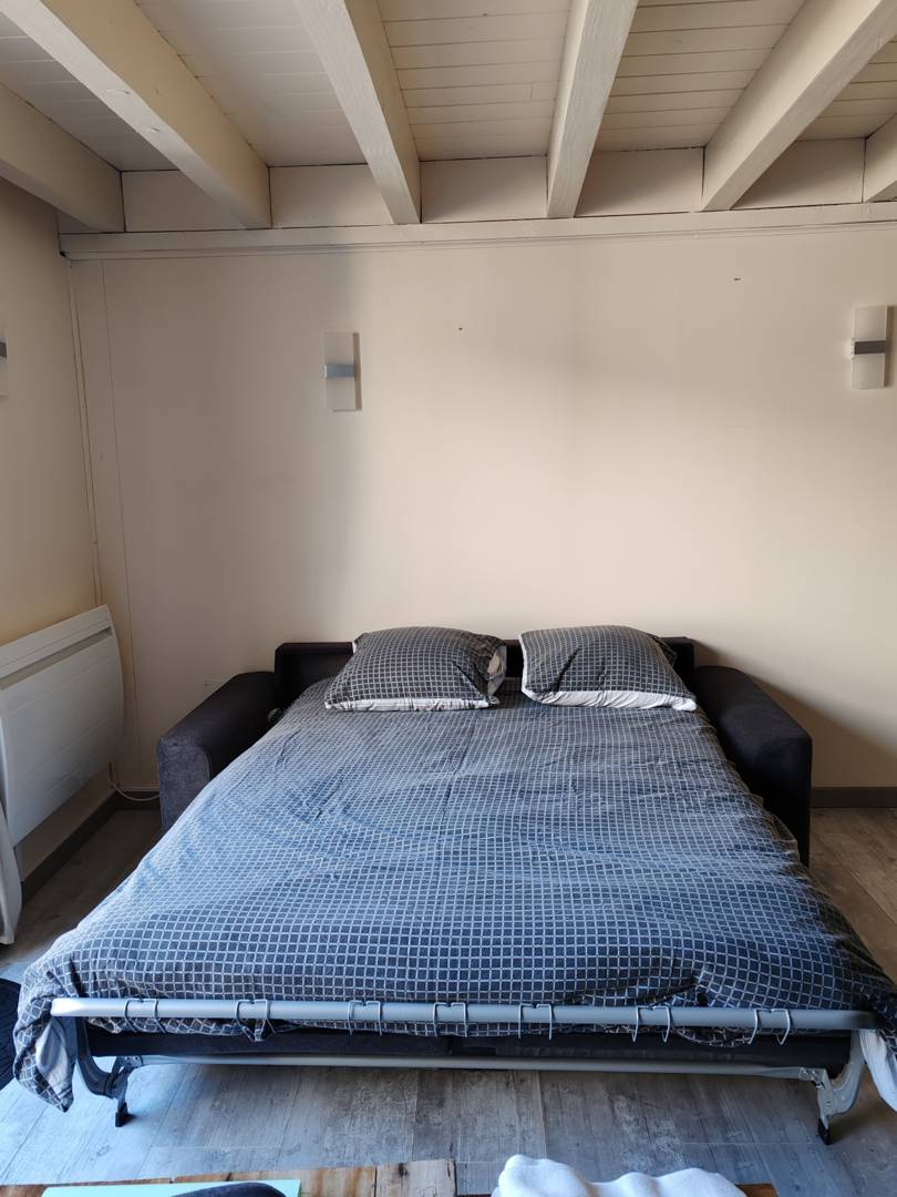 – d’une pièce de vie avec cuisine, salle à manger et salon avec canapé convertible