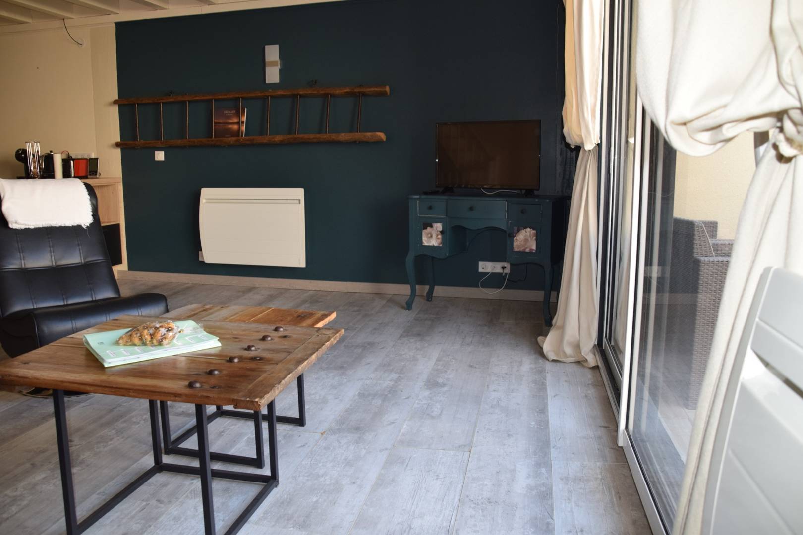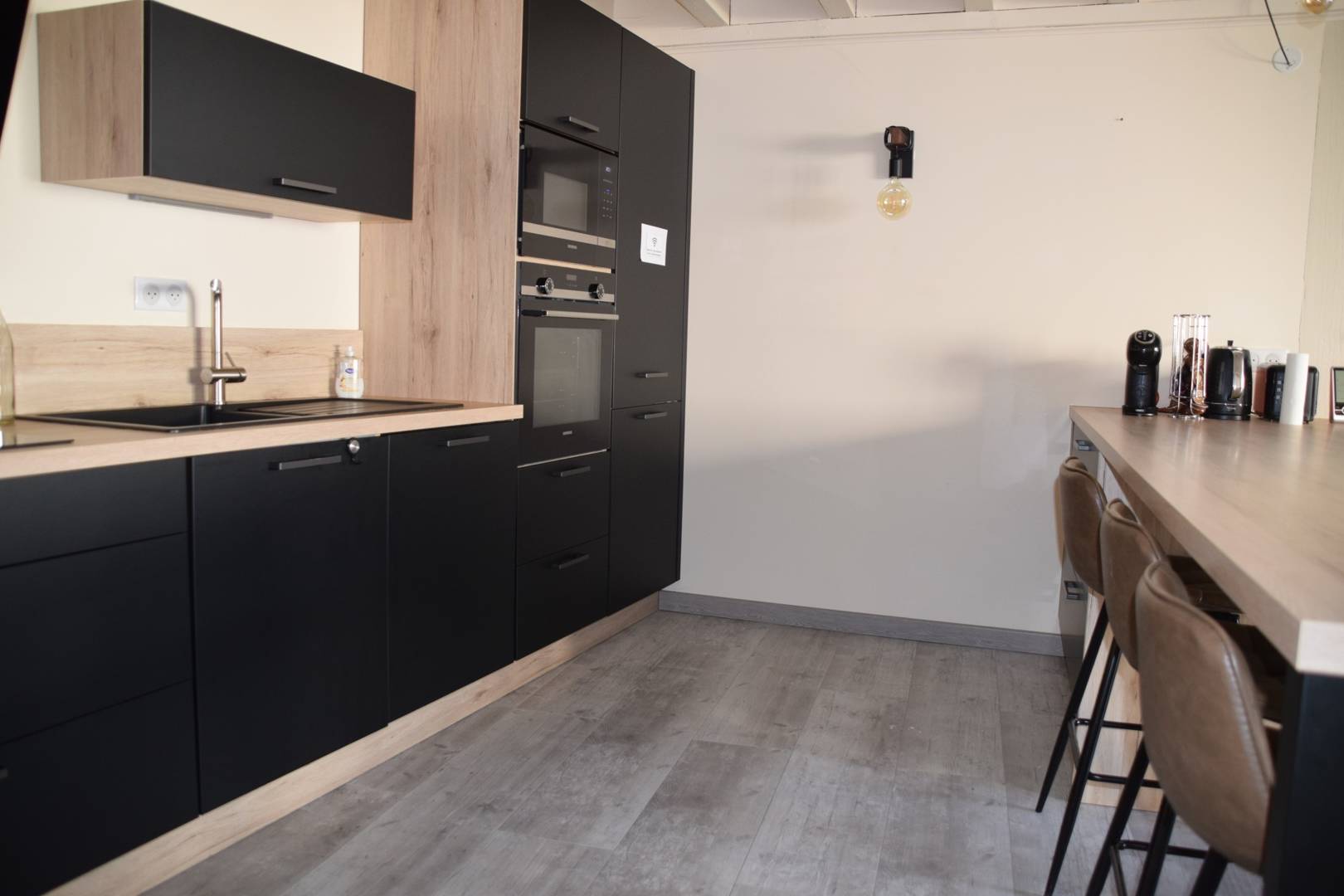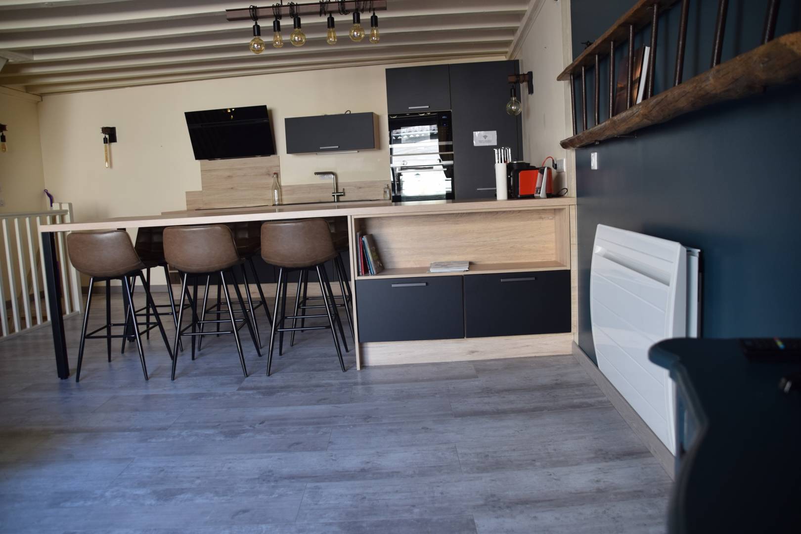 – d’une pièce de vie avec cuisine, salle à manger et salon avec canapé convertible