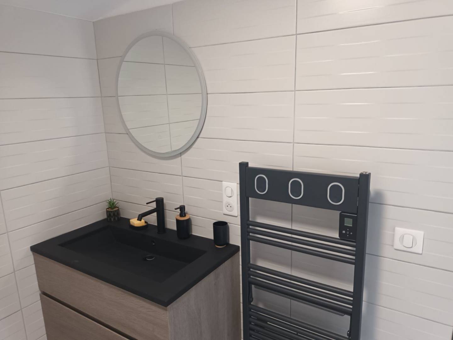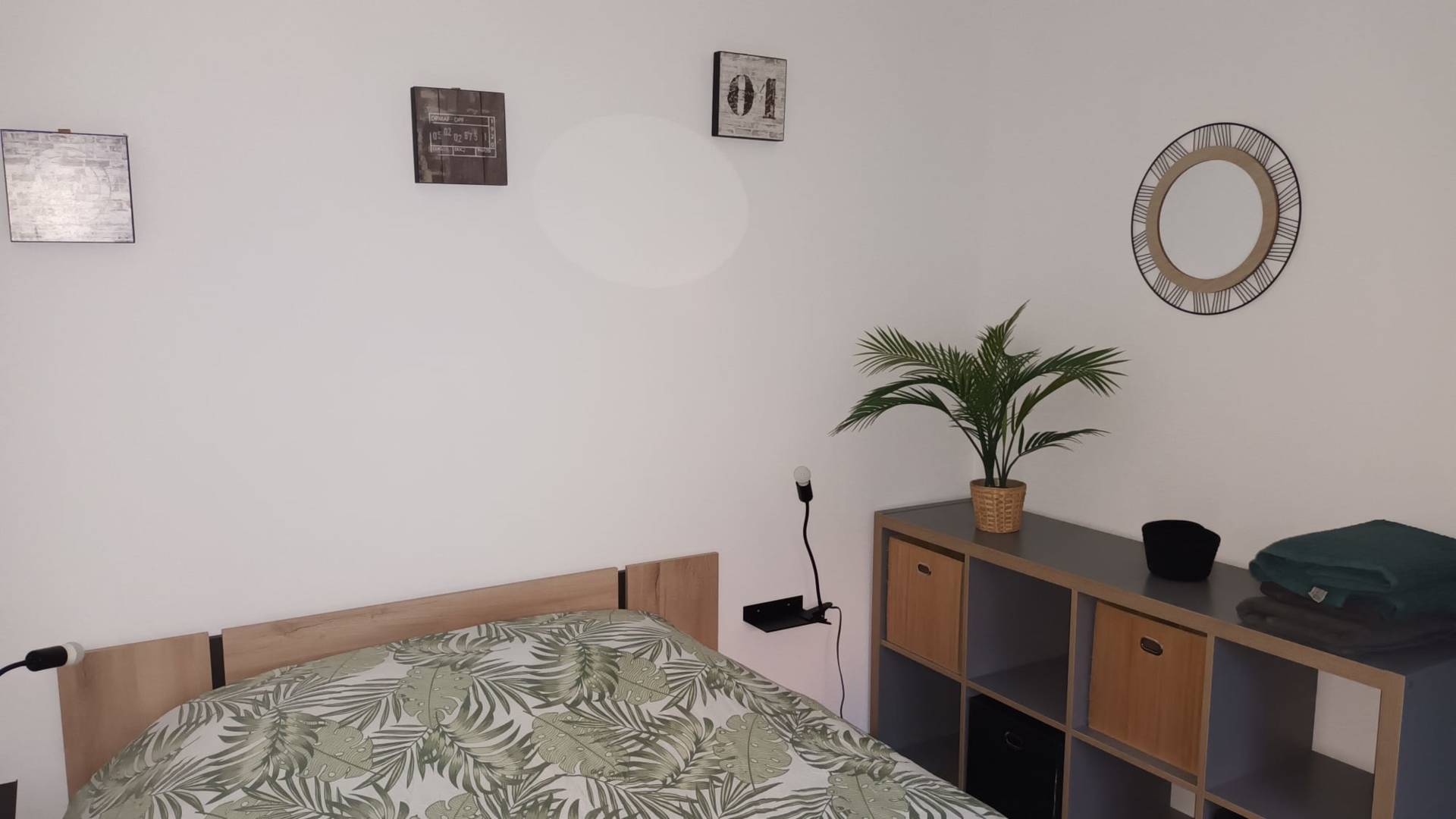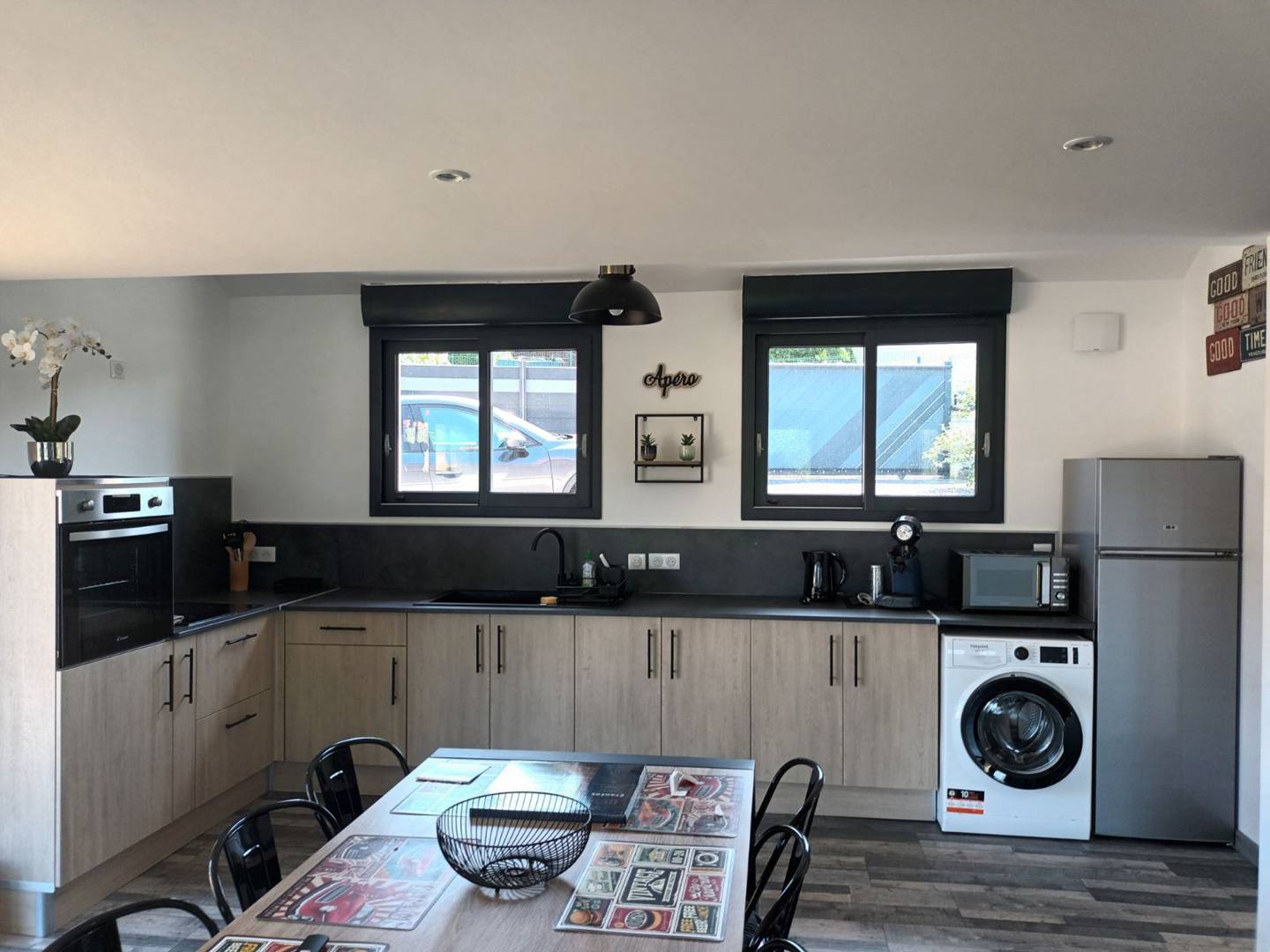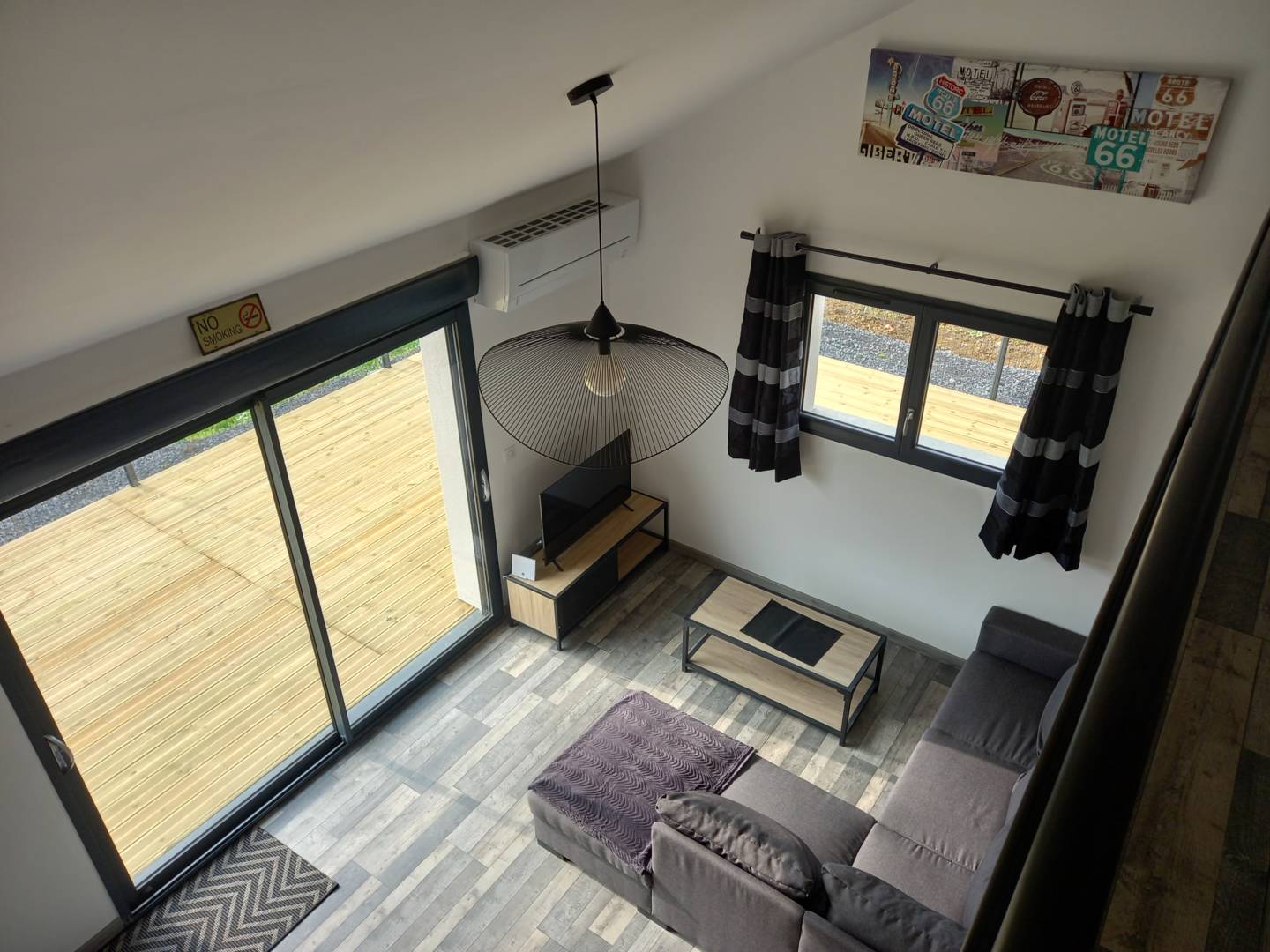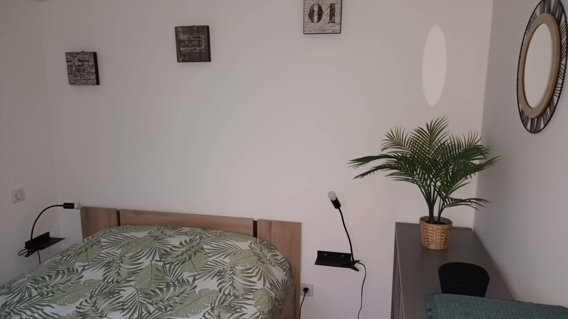 Ce gîte comprend une cuisine équipée (cafetière Senseo) ouverte sur salon/salle à manger avec canapé convertible et TV connectée. Une chambre (lit double), une chambre mezzanine (lit double + lit simple tiroir). Salle d’eau avec douche hydromassante, 1 vasque et wc. Climatisation