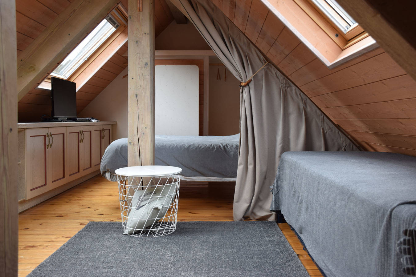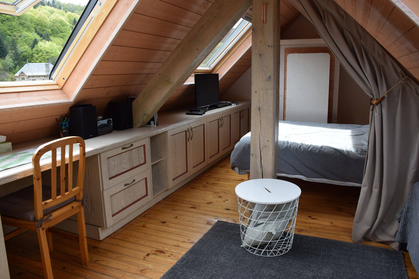 – une chambre : celle-ci dispose de trois lits (un lit double Bultex de 140×190 et deux lits simples gigogne de 80×190 avec matelas de qualité professionnelle), d’une télé HD avec lecteur dvd – blu-ray, d’une console de jeux Nes Mini, de nombreux rangements et d’un coin bureau. Des livres, guides de randonnée, jeux de société et DVD sont à votre disposition.
