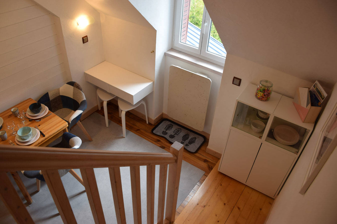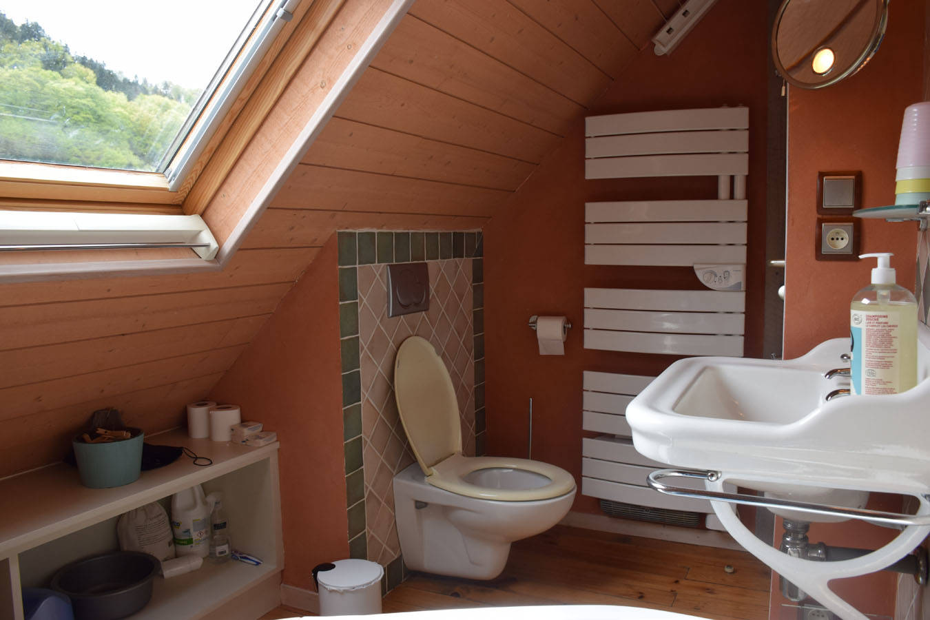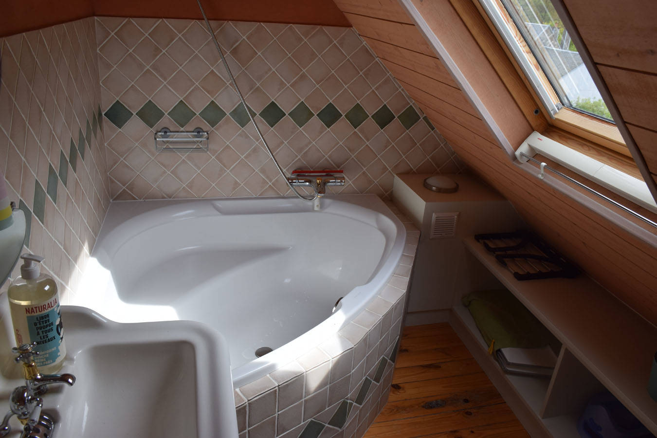 Attention à la tête (surtout pour les grands gabarits) : la salle de bain et la chambre à l’étage sont des pièces mansardées de 2,10 m de hauteur au centre avec deux poutres traversantes.