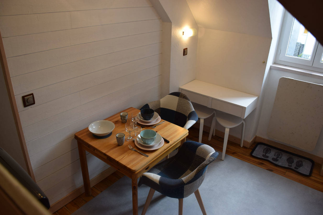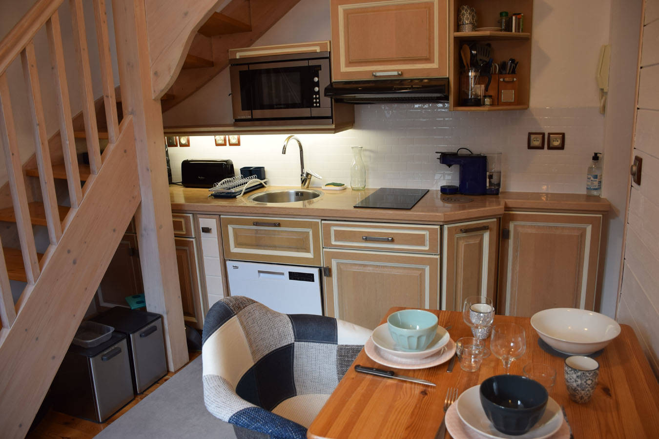 – une cuisine équipée avec petit lave-vaisselle, four micro-ondes, mini-four à chaleur tournante, grille-pain, cafetière Senseo, bouilloire, théière-cafetière à piston et appareil à raclette. Table avec rallonges, console, fauteuils de table, tabourets.