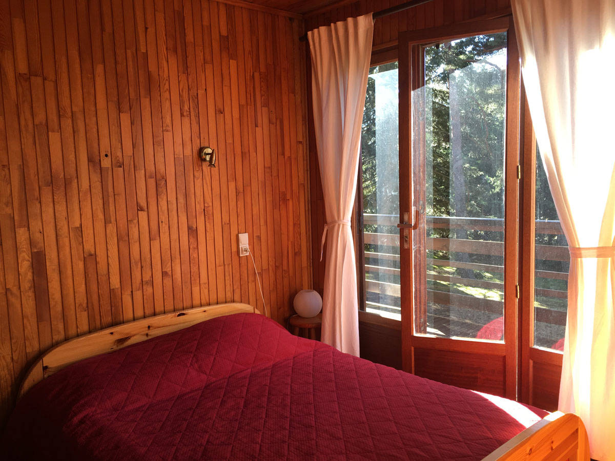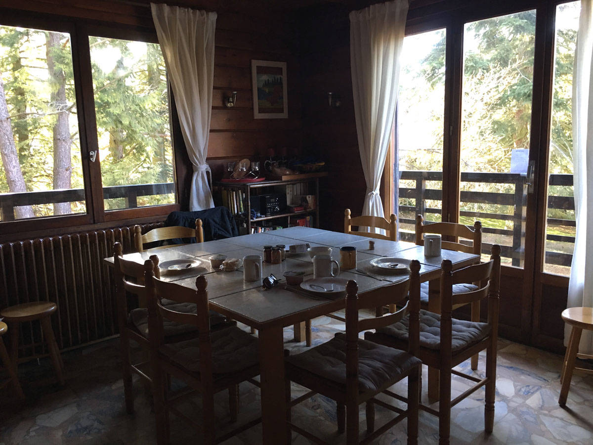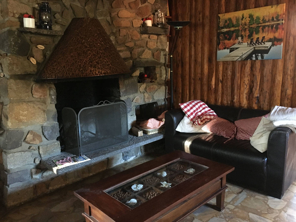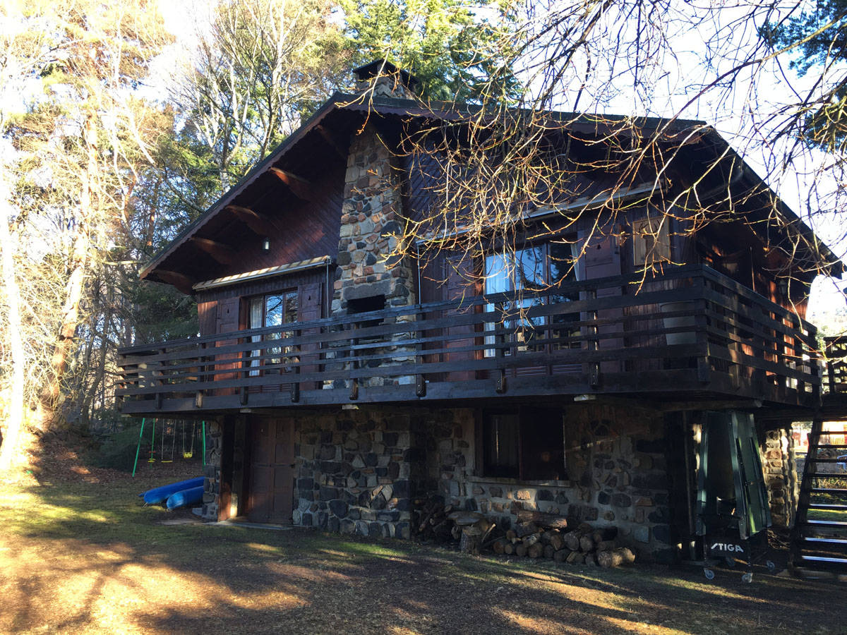 Grande salle à manger/salon avec cheminée traditionnelle en pierre, grande terrasse panoramique avec vue sur lac et barbecue en pierre. Cuisine entièrement équipée pour 8 personnes. Les murs en bois vous font ressentir la chaleur familiale du chalet traditionnel.