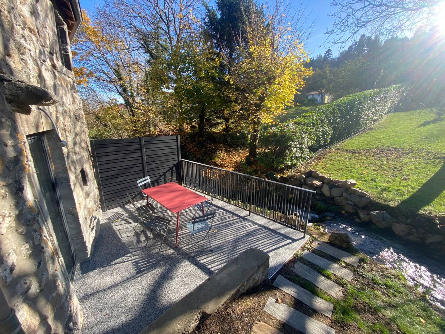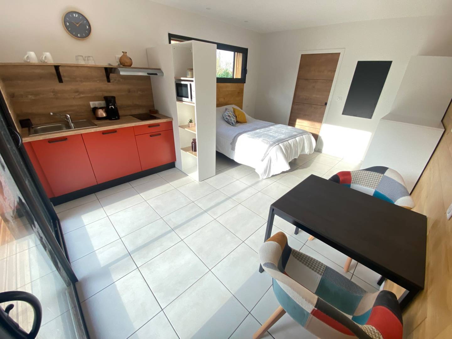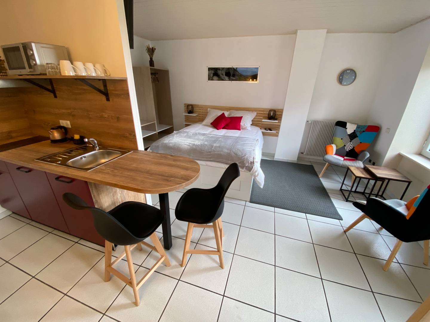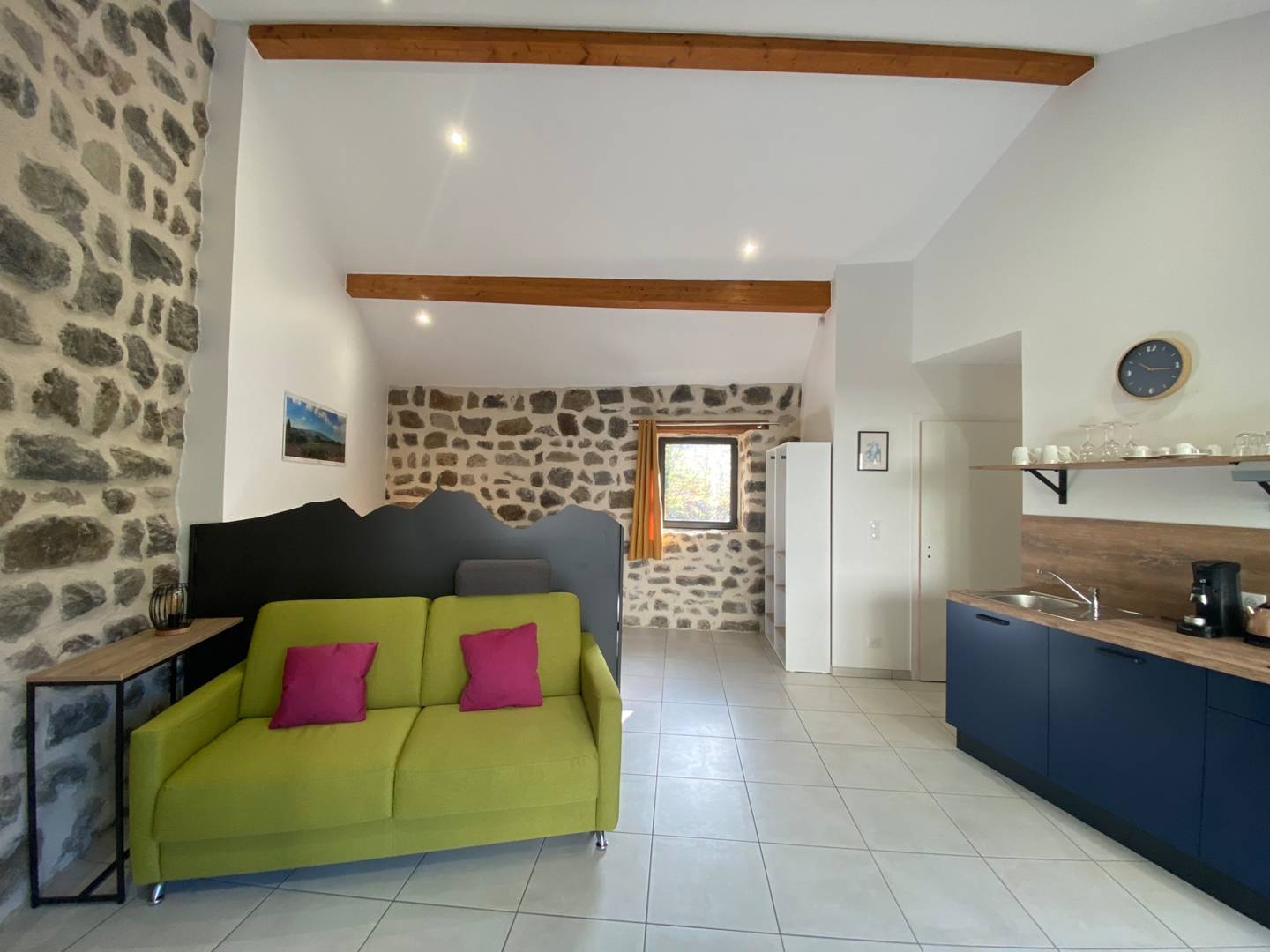 Au rez de chaussée d’une ancienne ferme en pierres apparentes construite au début du 20° siècle, ce gîte est un véritable studio indépendant avec son extérieur, son entrée privative, son coin « salon », sa cuisine équipée, son lit double, ses rangements et sa salle d’eau privative avec wc indépendant.