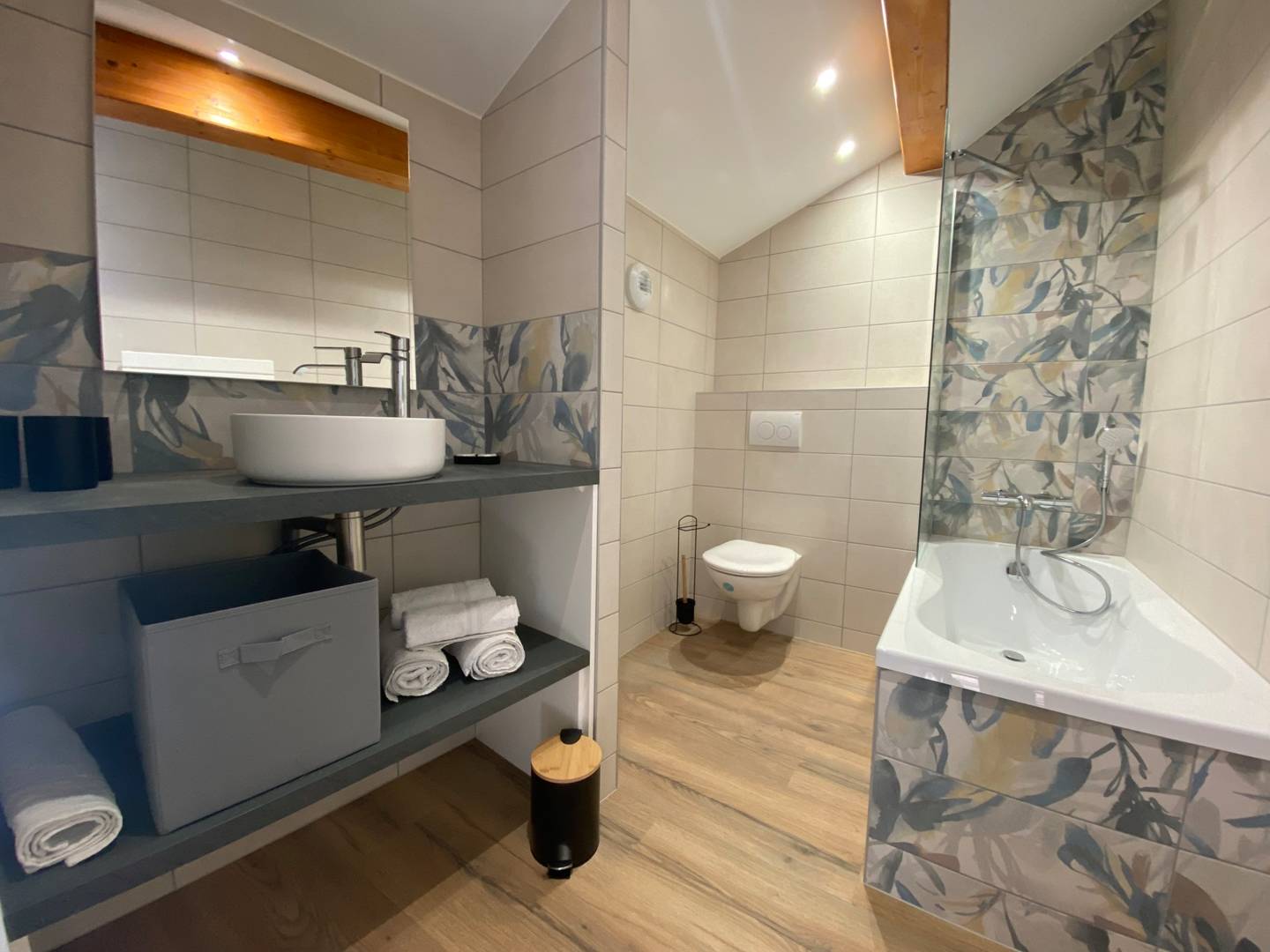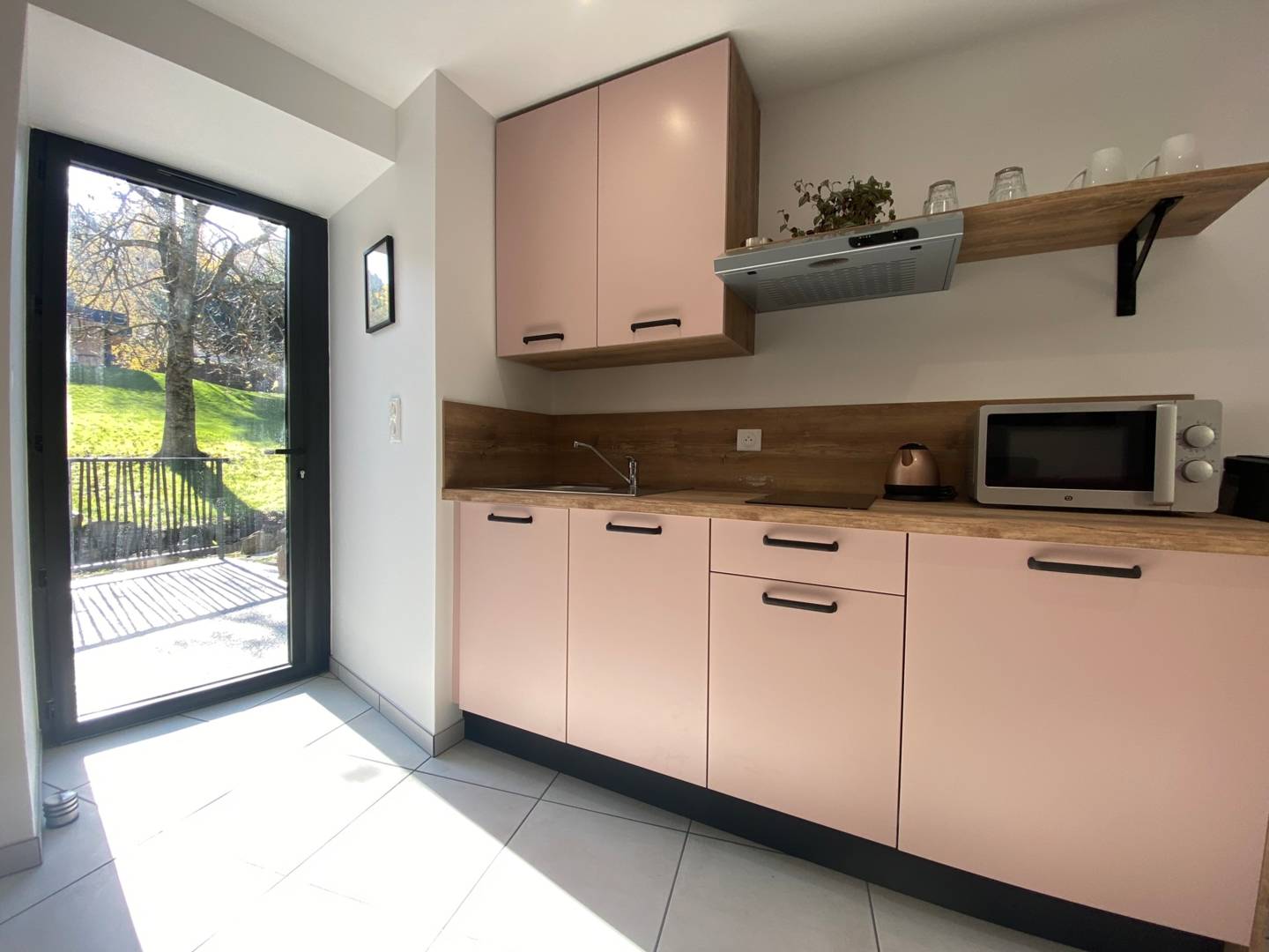 Dans le chalet contemporain, en rez de jardin, gîte « hyper-lumineux » avec sa baie vitrée qui permet un accès à une jolie terrasse en bois totalement privative. Il comprend une cuisine équipée, un lit double, des rangements, une salle d’eau avec wc indépendant. Il peut accueillir une à deux personnes. Possibilité de rajouter un lit d’appoint pliable en 90 cm.
