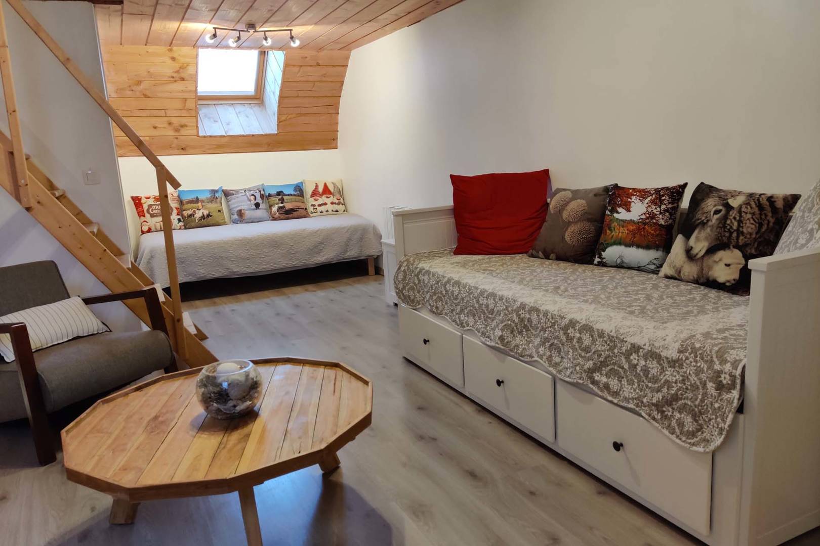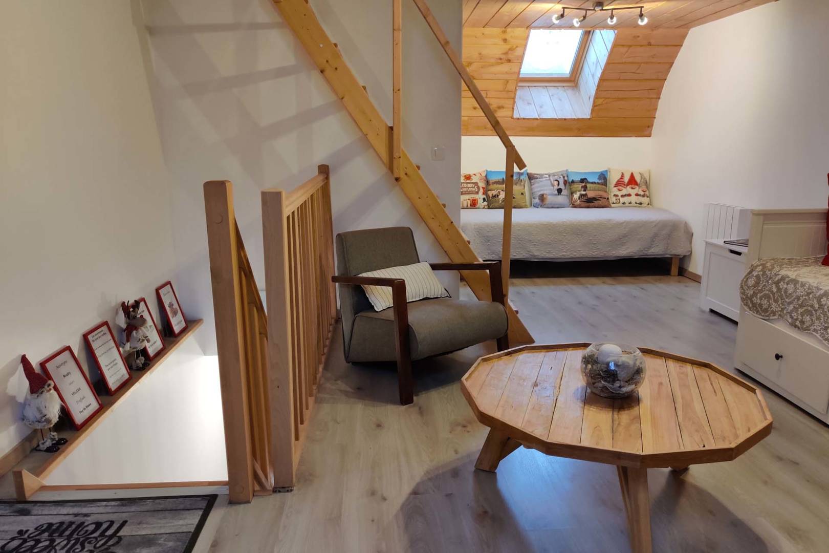 Un escalier en bois mène au premier étage, aménagé en un espace multifonction cosy.