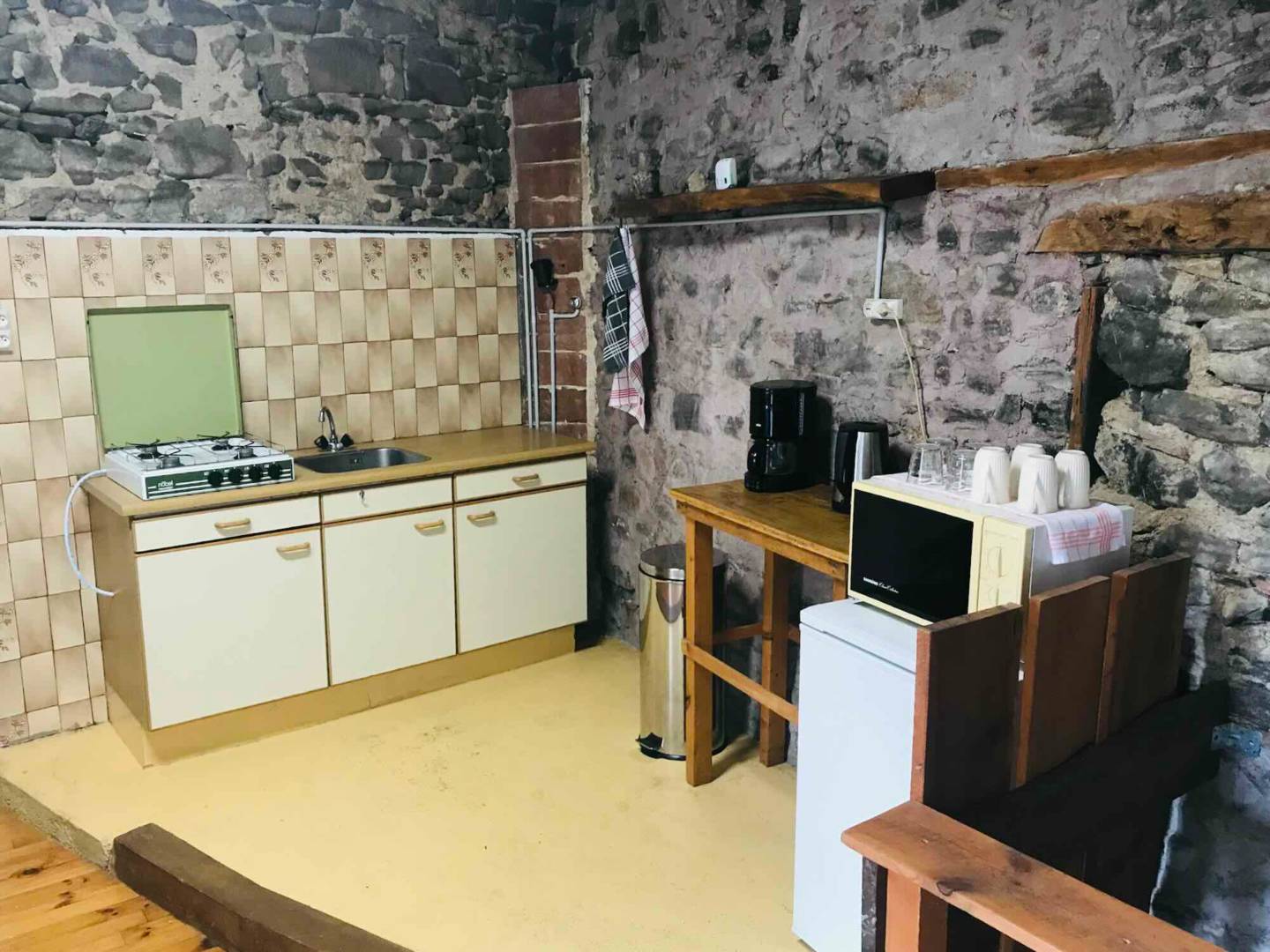 Le gîte, avec son entrée indépendante, est réparti sur deux niveaux. À l’étage se trouve la cuisine/salle à manger avec un canapé-lit, et au rez-de-chaussée se trouvent la chambre double, une douche et des toilettes. Une terrasse est disponible à l’étage et au rez-de-chaussée. La location du gîte comprend les ustensiles de cuisine, le linge de lit et les serviettes.