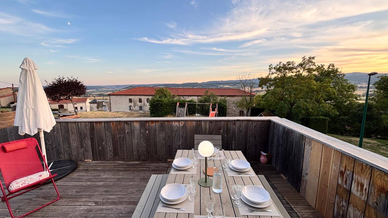 La terrasse quand à elle comprend une table à manger, un parasol ainsi que deux transats.