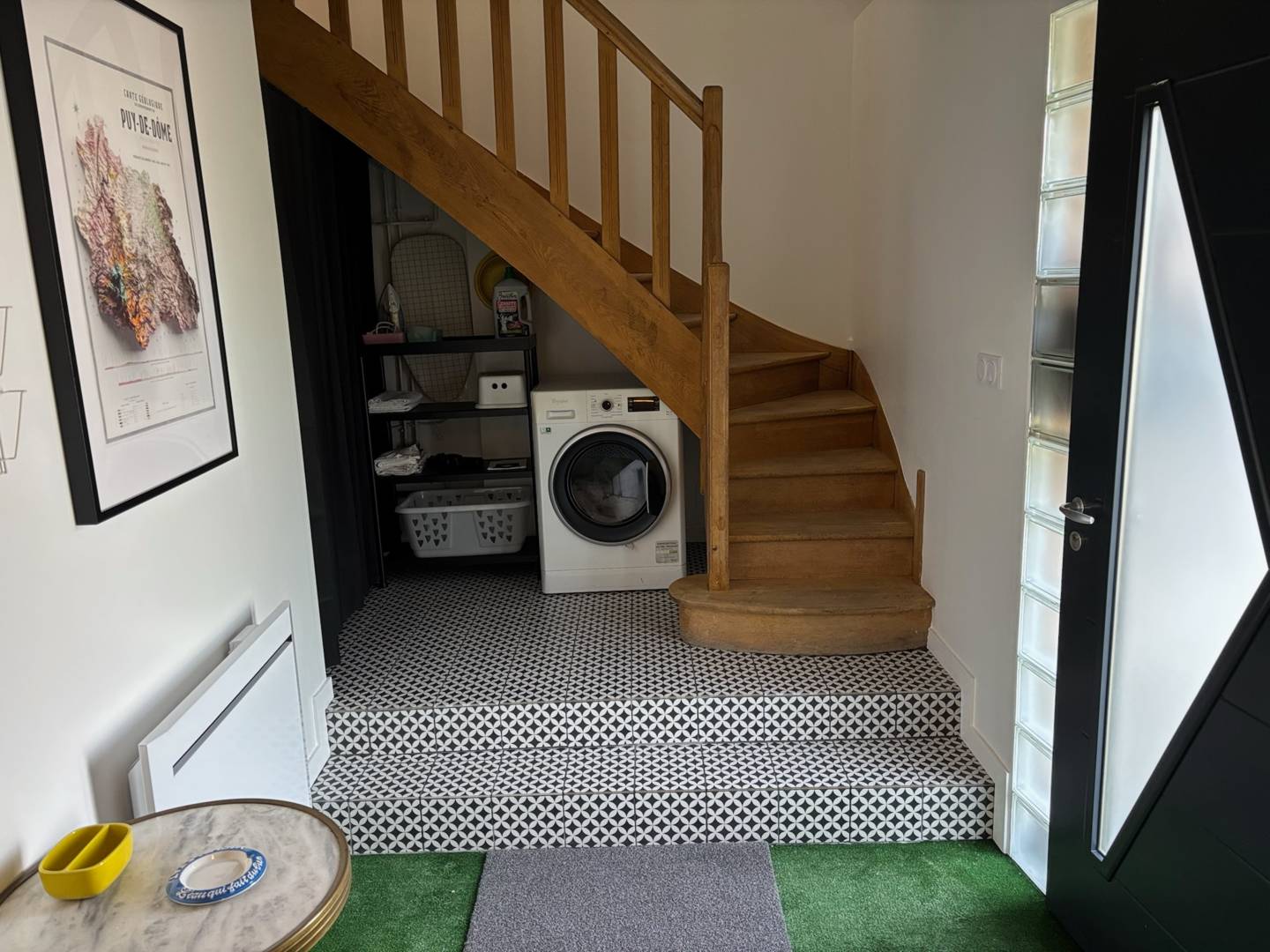 Le logement comprend une entrée qui est aussi la buanderie. Le reste de la maison est accessible à l’étage par un escalier.