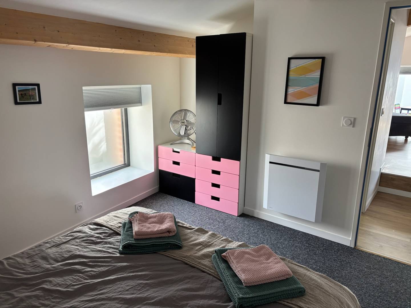 Une chambre avec un lit double en 160cm et fenêtre fixe.