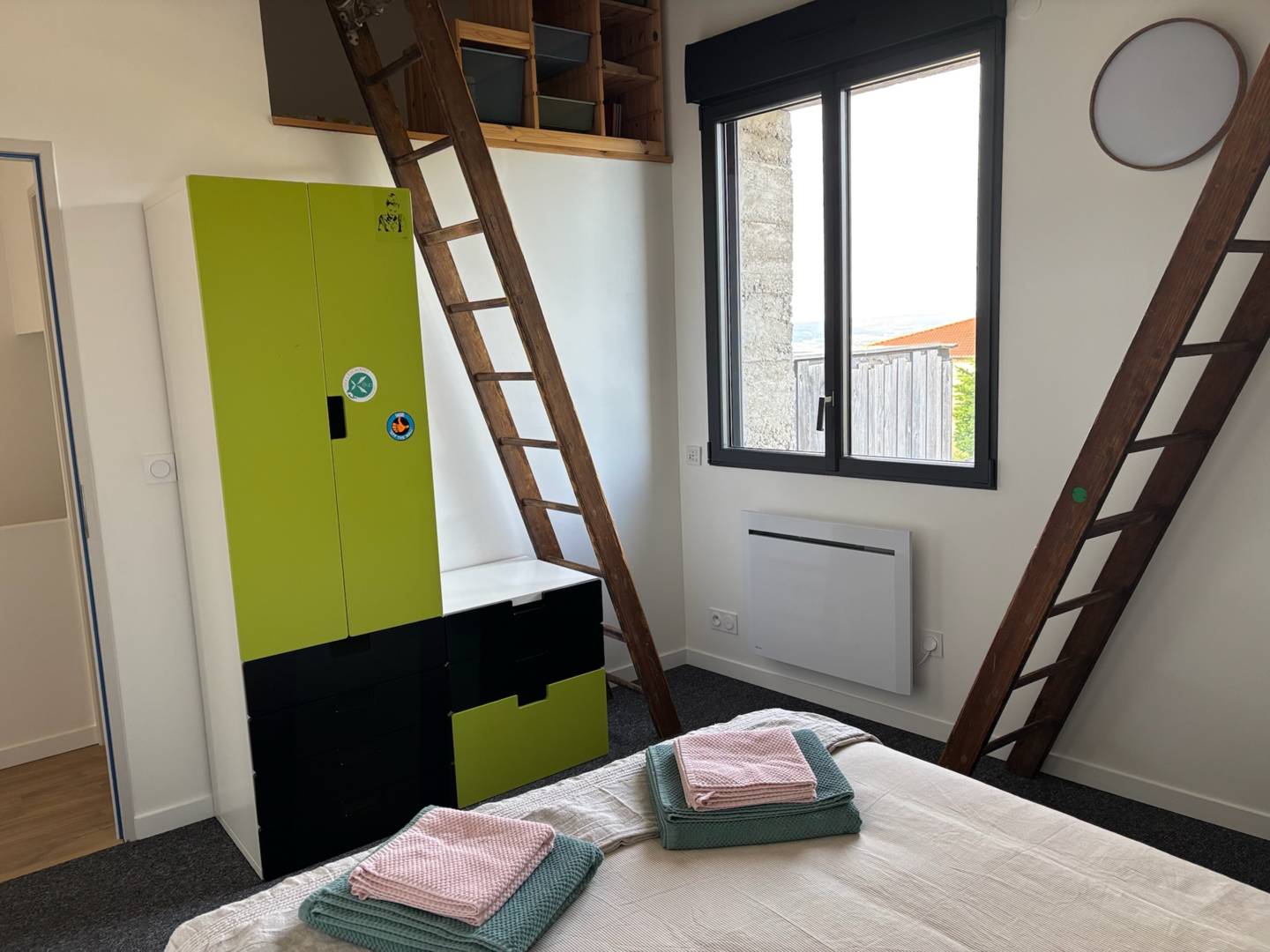 Une chambre avec un lit double en 140cm, et deux mezzanines avec chacune une lit simple en 90cm pour enfants aimant les cabanes et accessibles uniquement par échelle 😉 et fenêtre ouvrante.