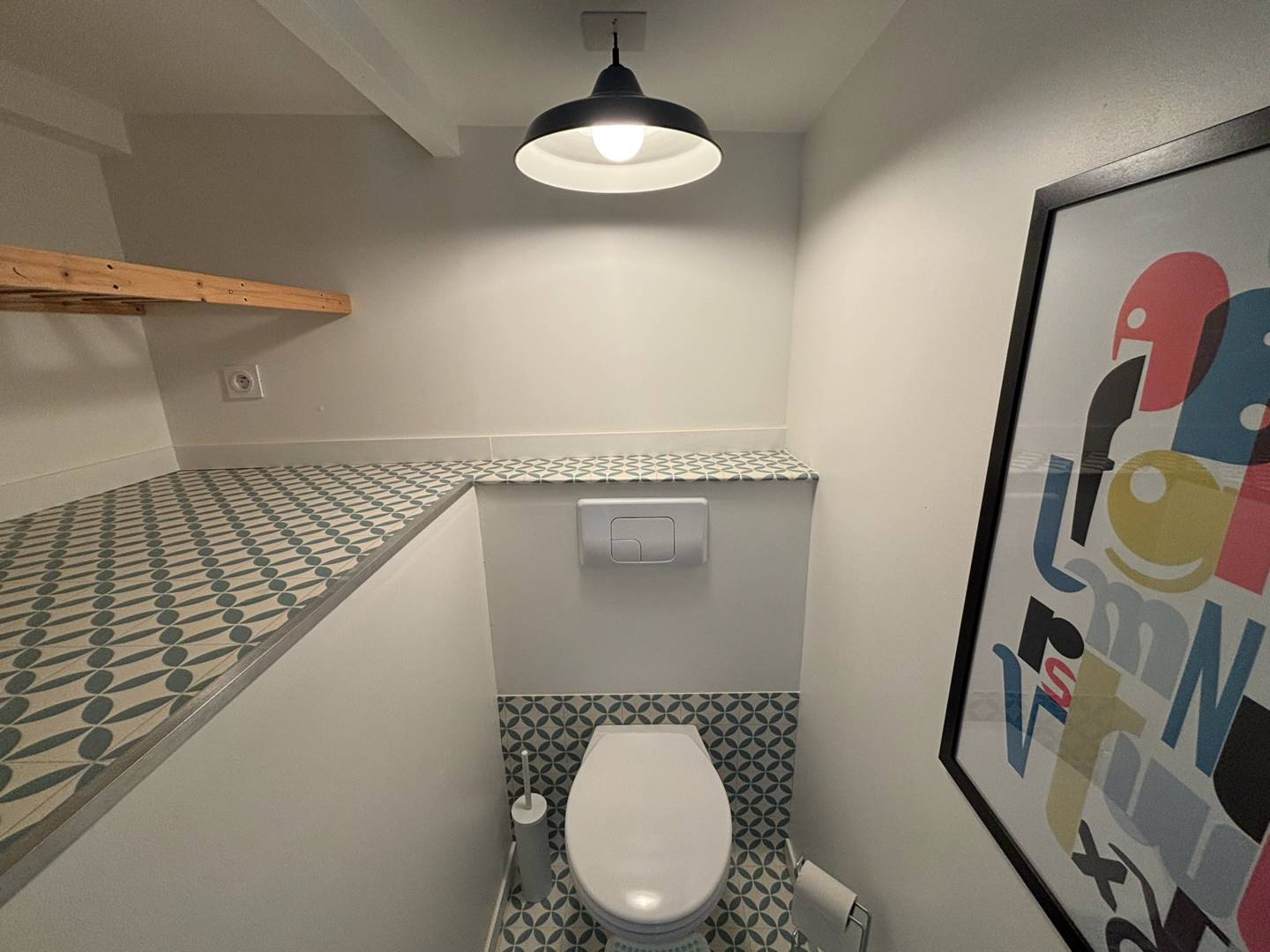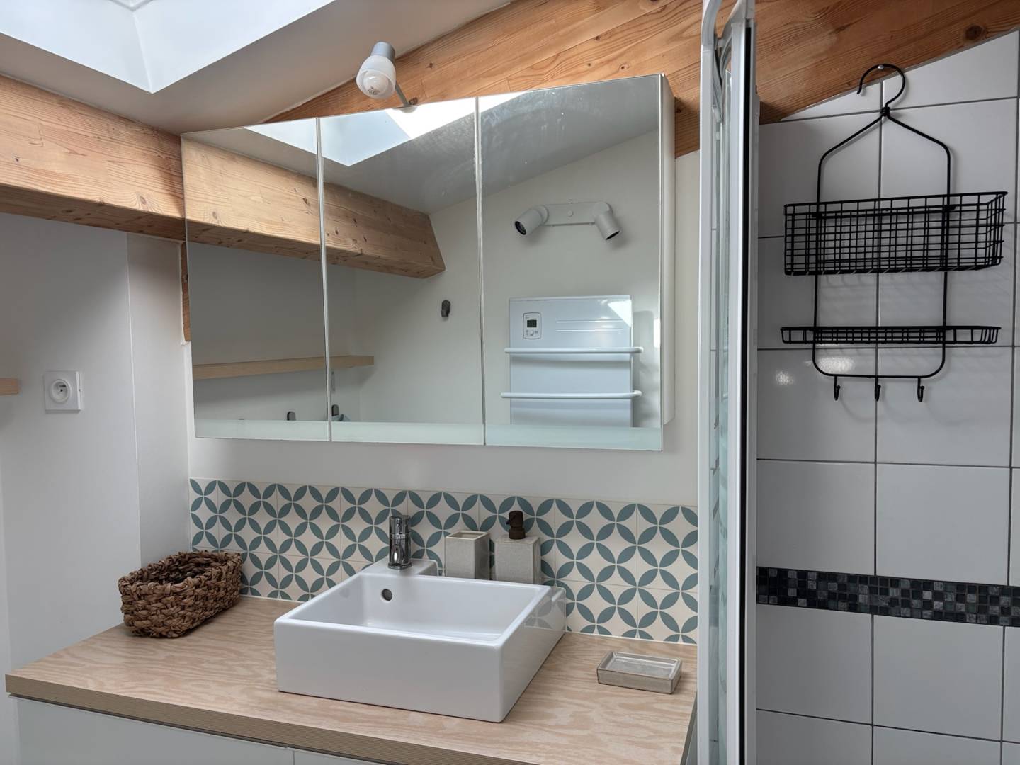 La salle de bain comprend une vasque, rangements, douche et fenêtre de toit.