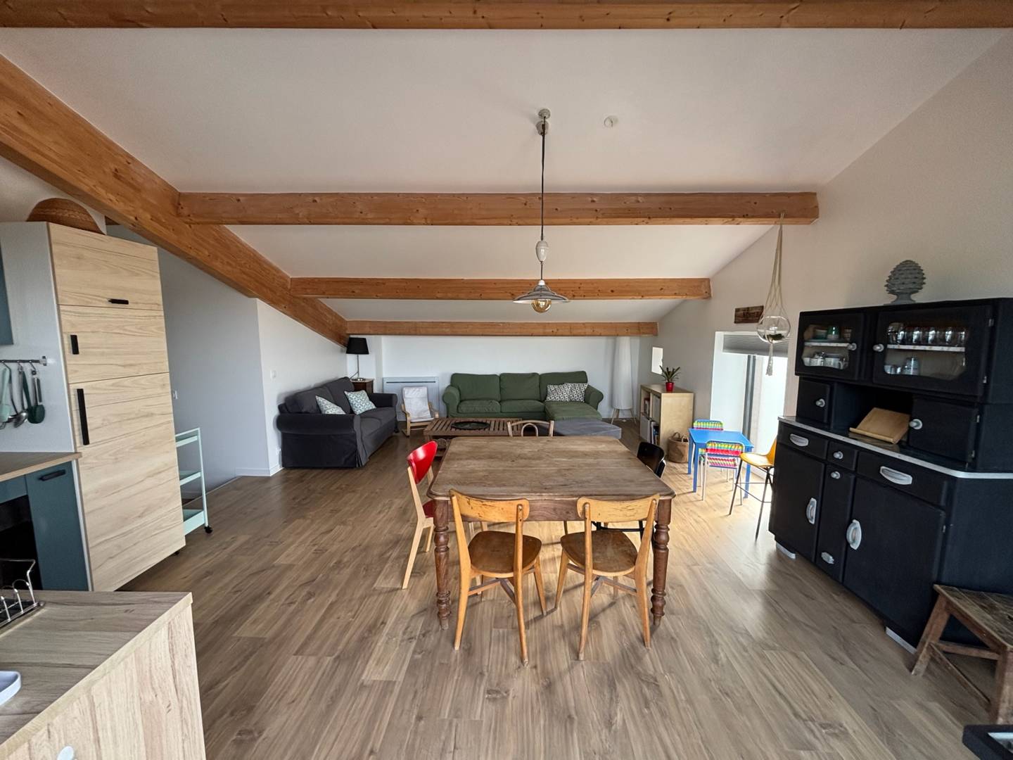 Le salon/salle à manger possède deux grands canapés, une table pour manger confortablement à 6, une cuisine entièrement équipée et un vaisselier.