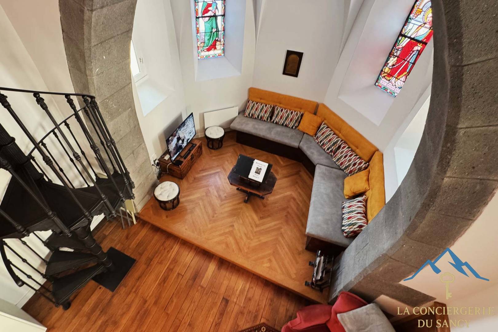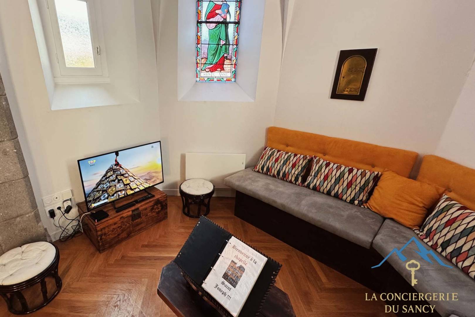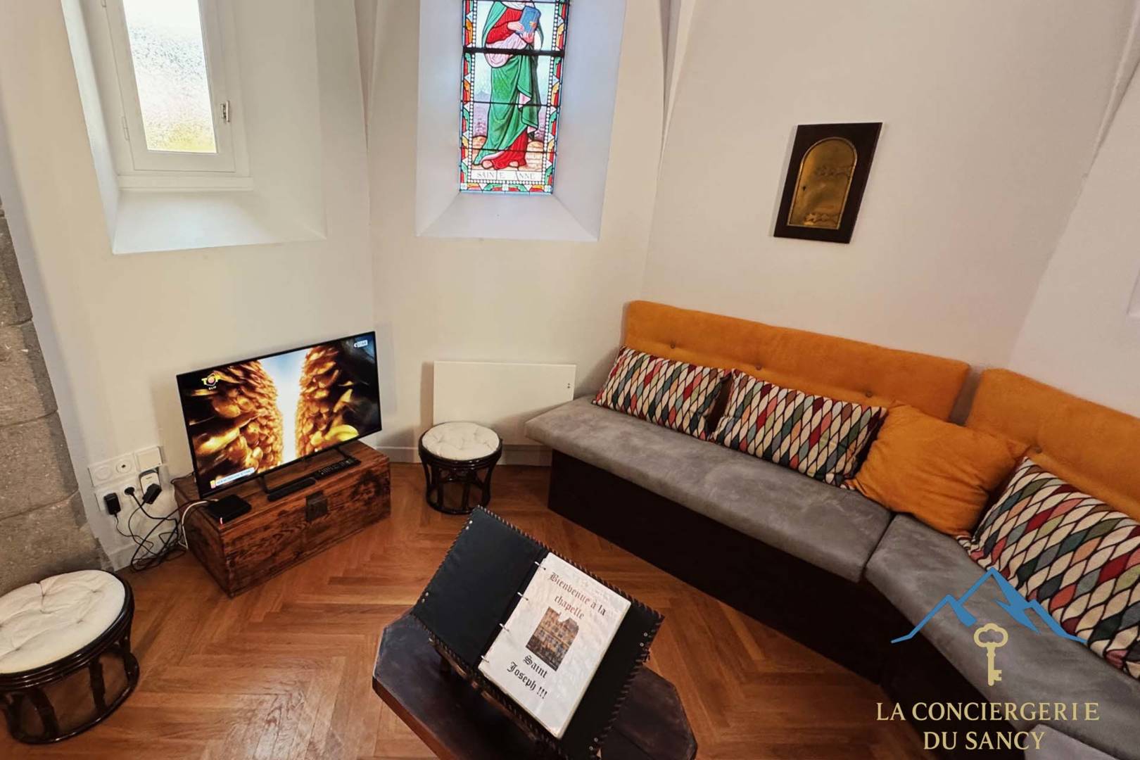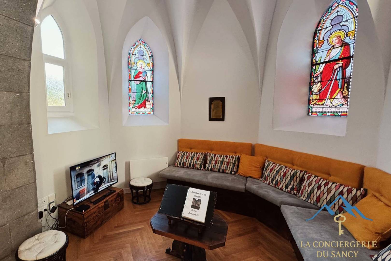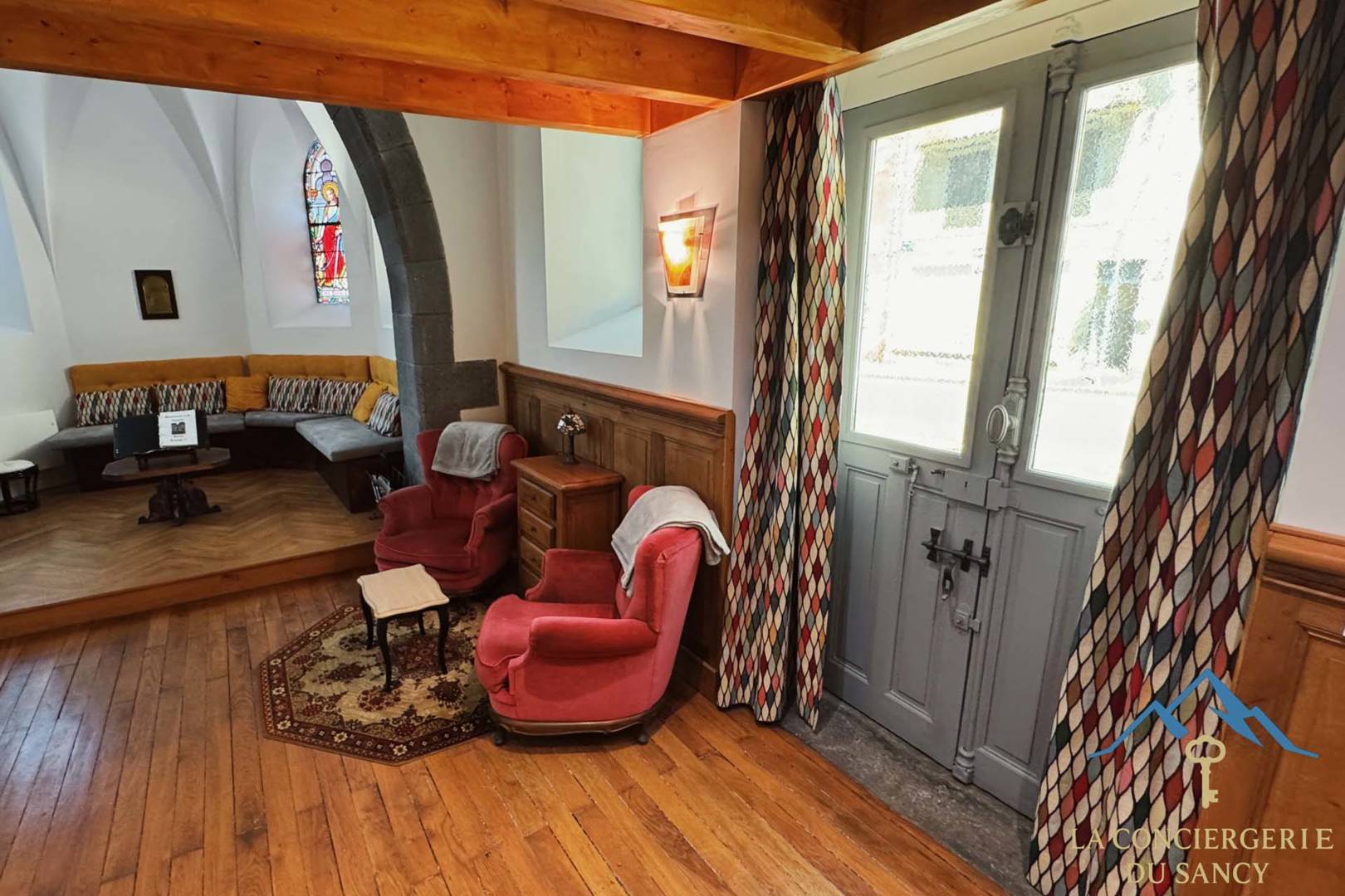 Le salon installé dans la nef de l’ancienne chapelle, avec ses vitraux et sa grande hauteur sous voûte, crée une atmosphère paisible et inspirante.