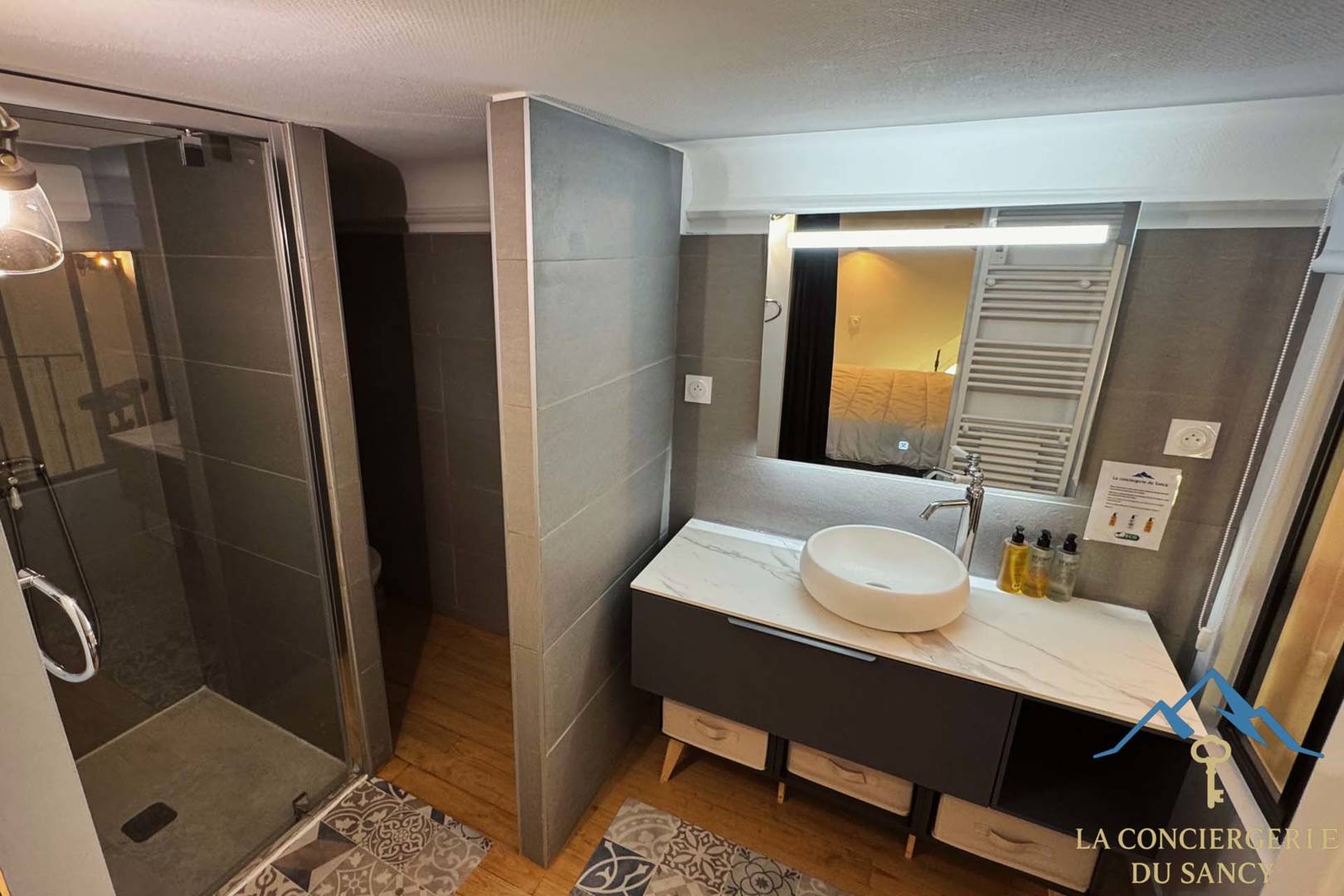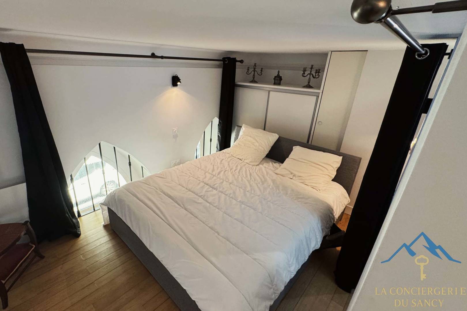 La chambre ainsi que la salle d’eau se trouvent sur une mezzanine au style cosy, avec 1,88 m de hauteur sous plafond, et des espaces de rangement intégrés. Un WC supplémentaire est disponible au rez-de-chaussée pour plus de confort.