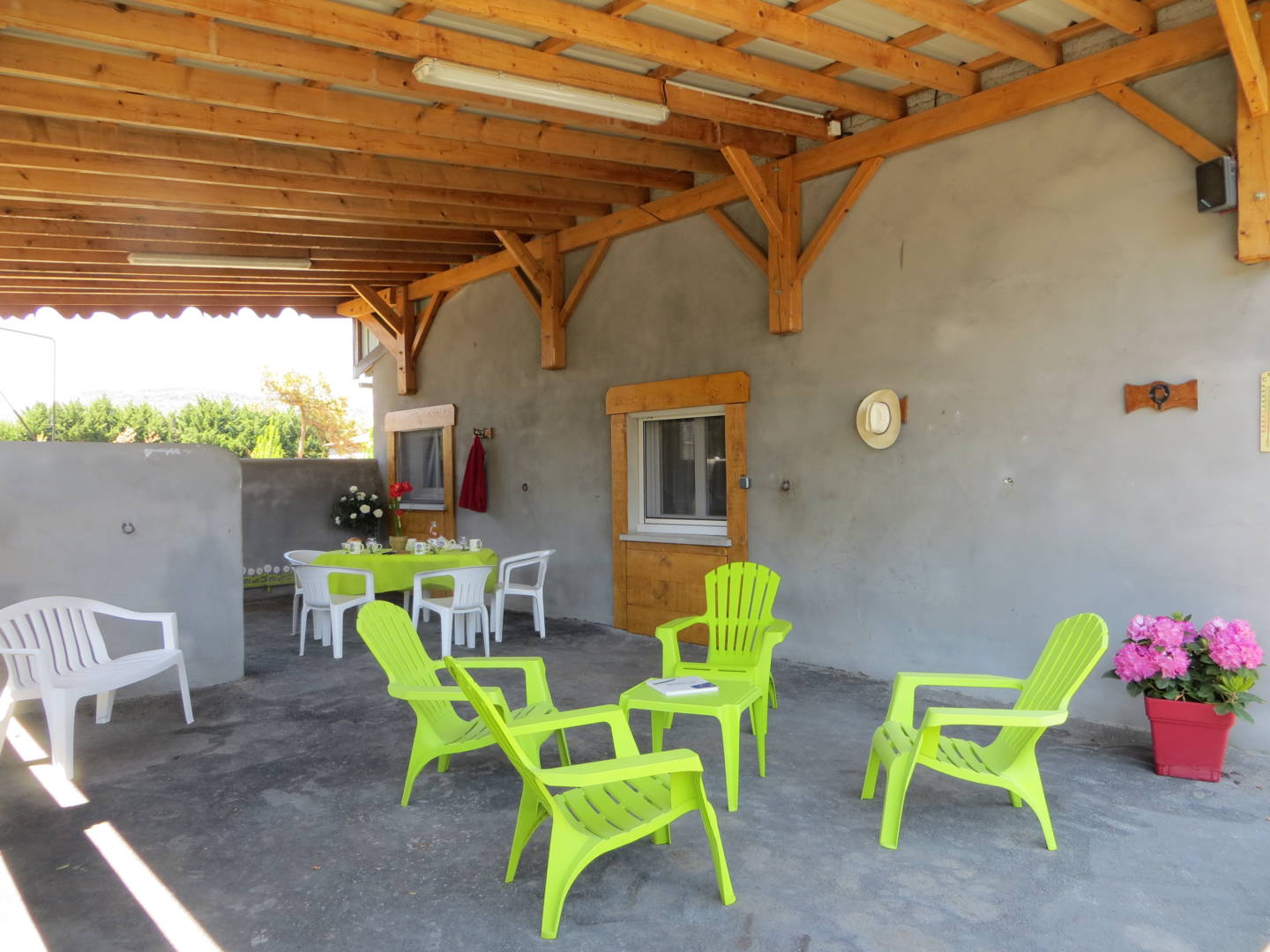 Le gîte propose une cour fermée avec deux accès principaux, un abri sécurisé pour véhicules, une terrasse de 60 m2 couverte et aménagée, un coin barbecue pour vos soirée d’été