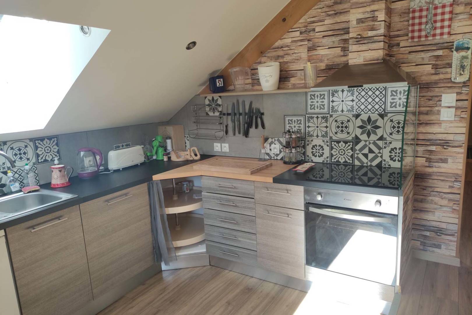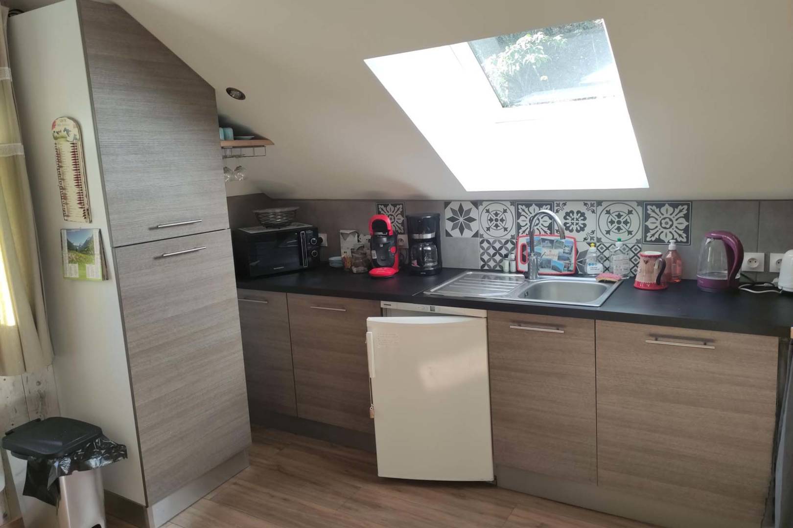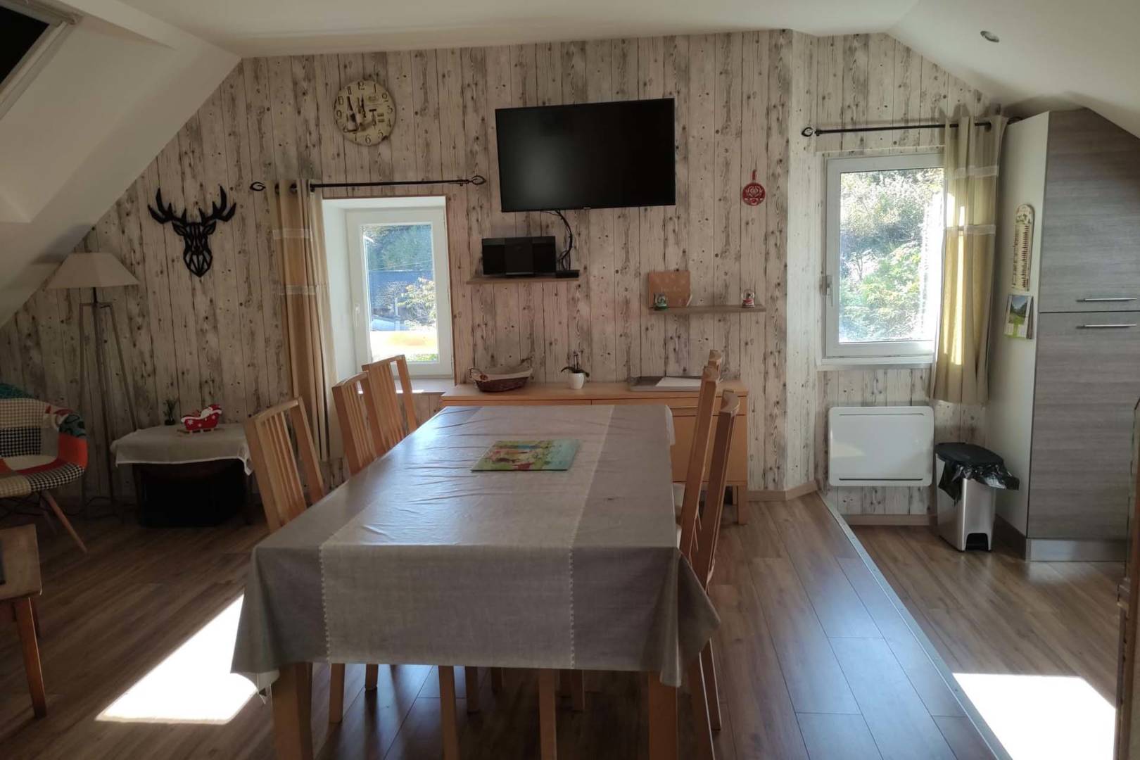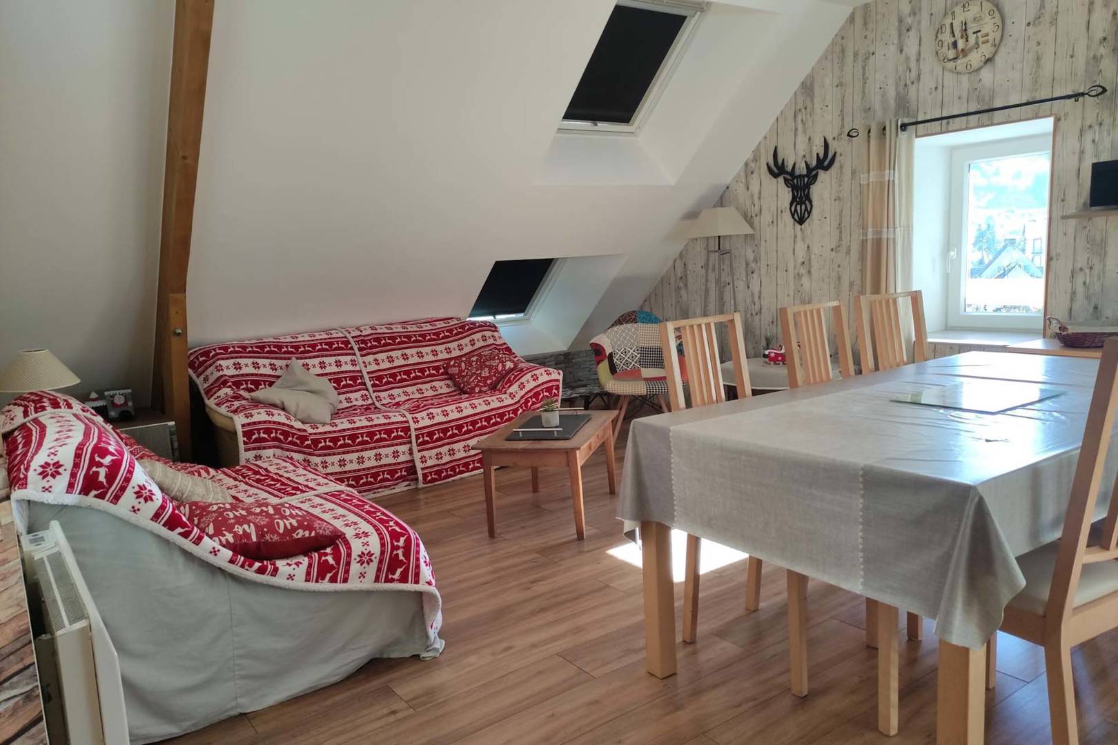 L’appartement peut accueillir 8 personnes. Celui-ci comprend une grande pièce à vivre avec un BZ, un canapé, table et chaises, donnant sur une cuisine entièrement équipée.