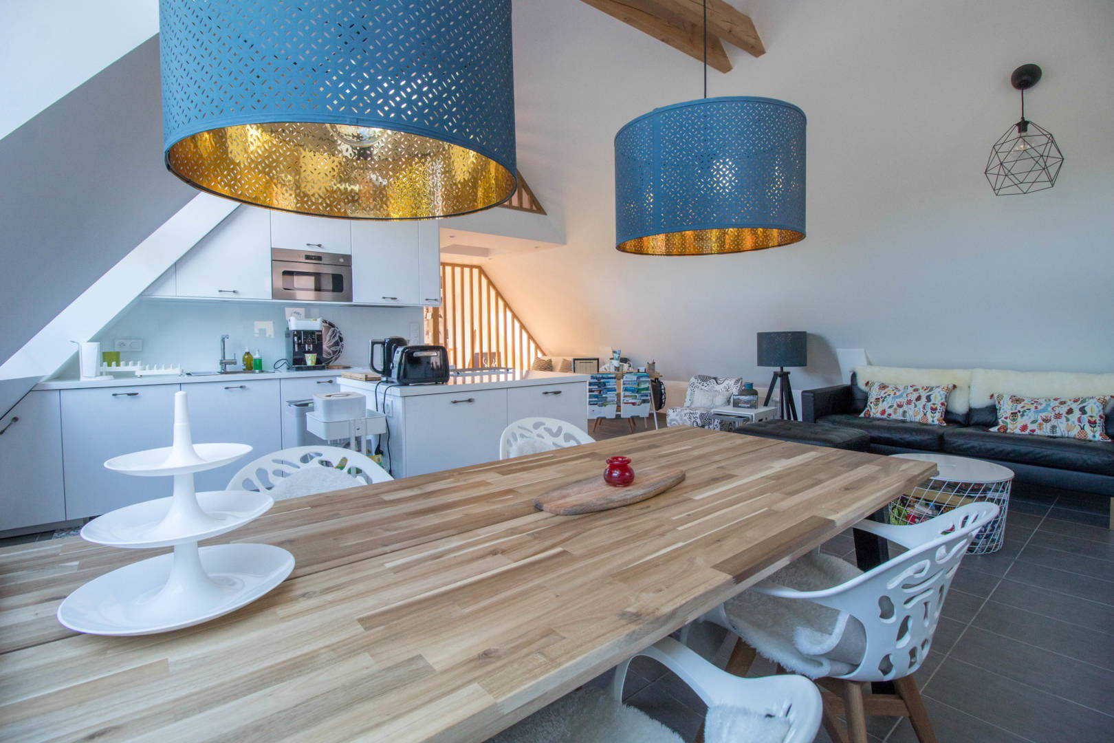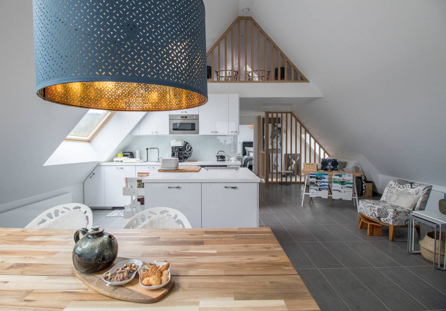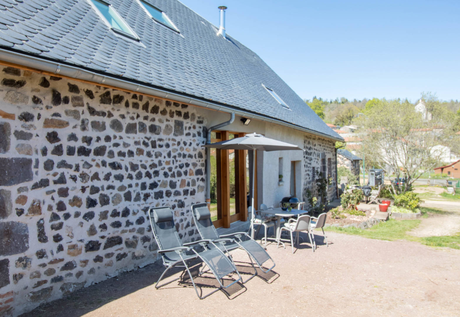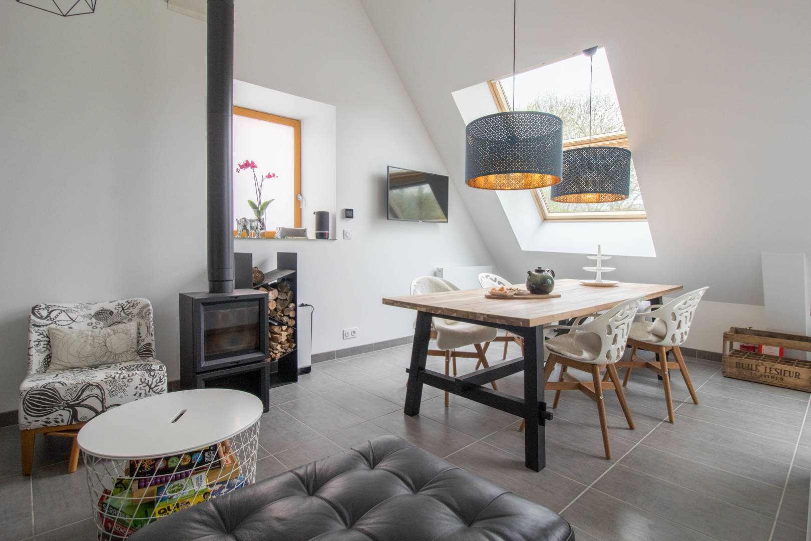 Au 1er étage: une grande et très lumineuse pièce de vie comprenant un espace salon avec un poêle, un espace repas, une cuisine ouverte, un espace bureau connecté, un canapé convertible de 140, une chambre avec un lit de 160, une salle(…)