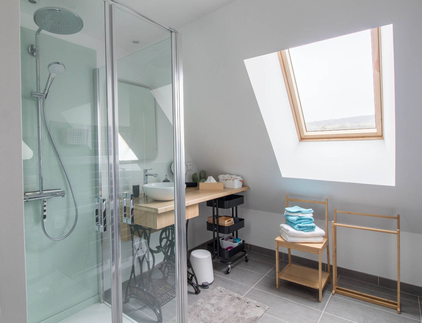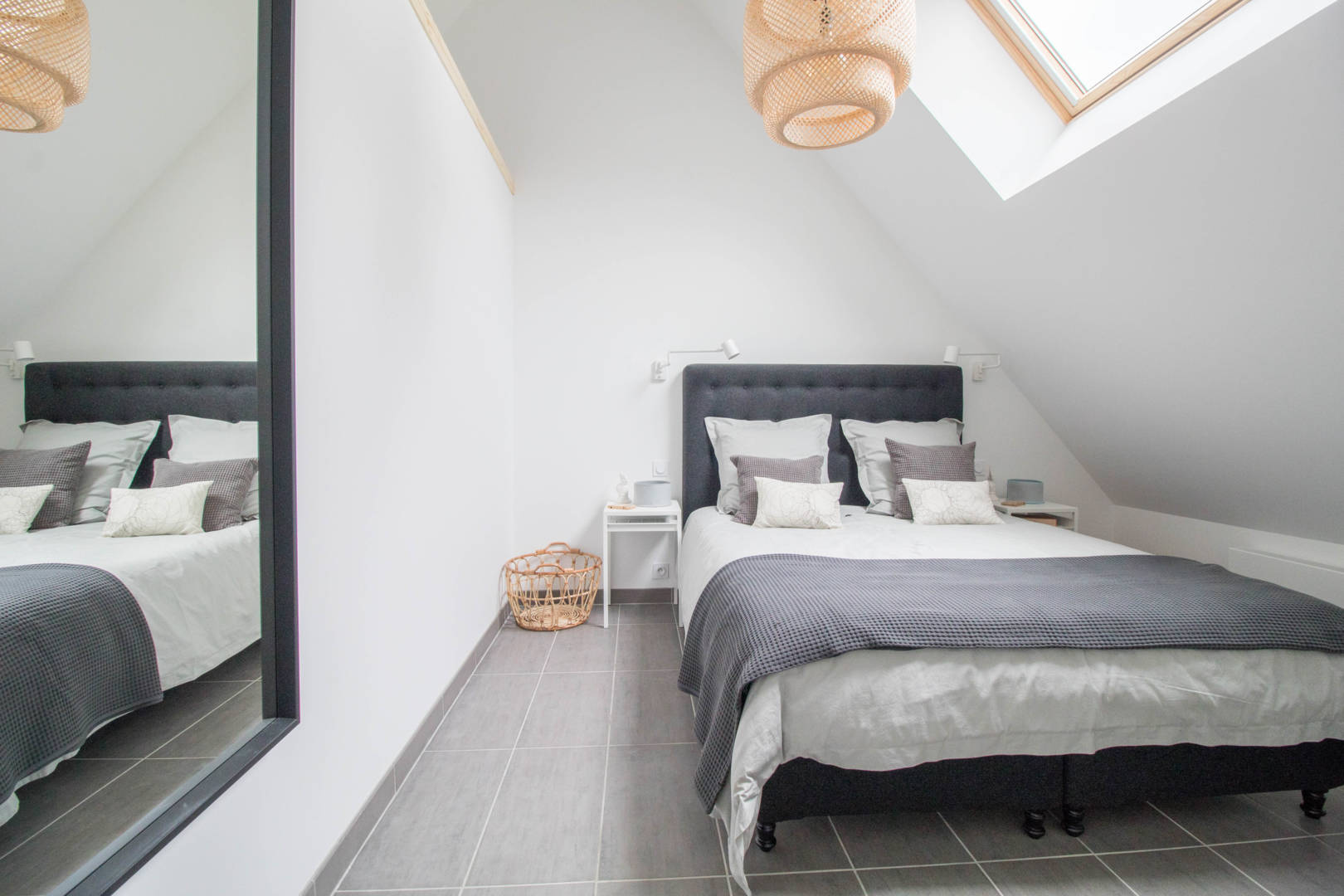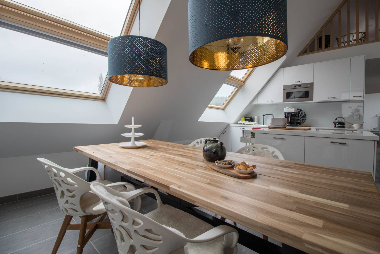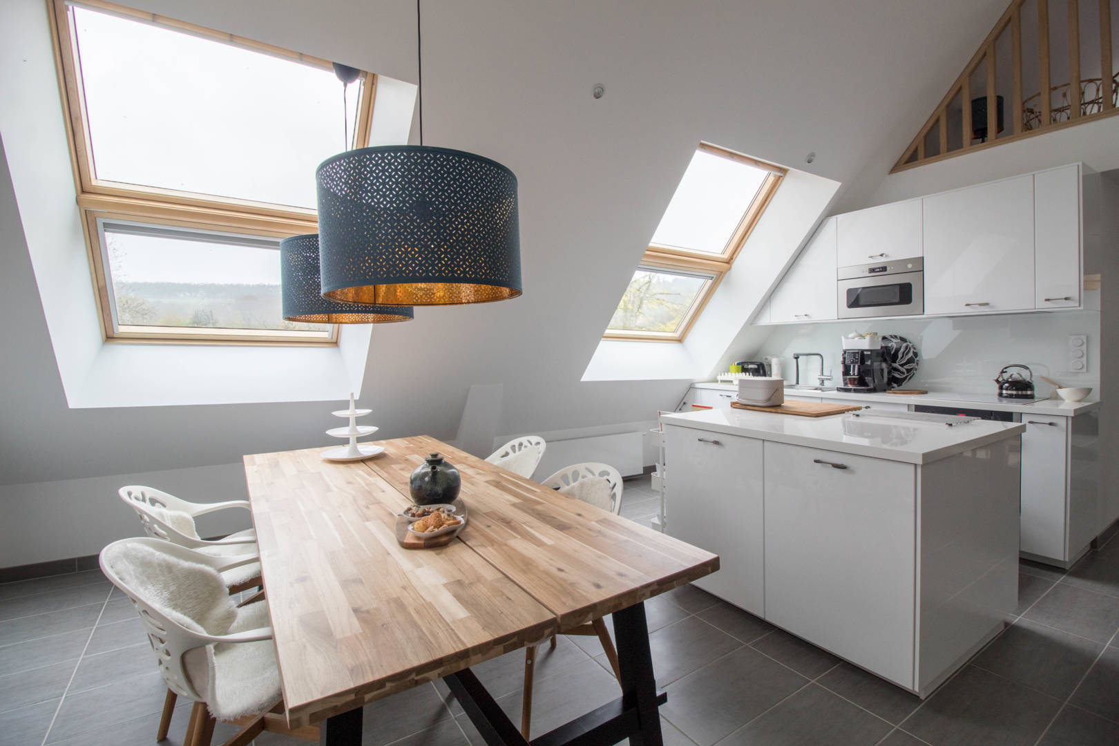 Au 1er étage: une grande et très lumineuse pièce de vie comprenant un espace salon avec un poêle, un espace repas, une cuisine ouverte, un espace bureau connecté, un canapé convertible de 140, une chambre avec un lit de 160, une salle(…)