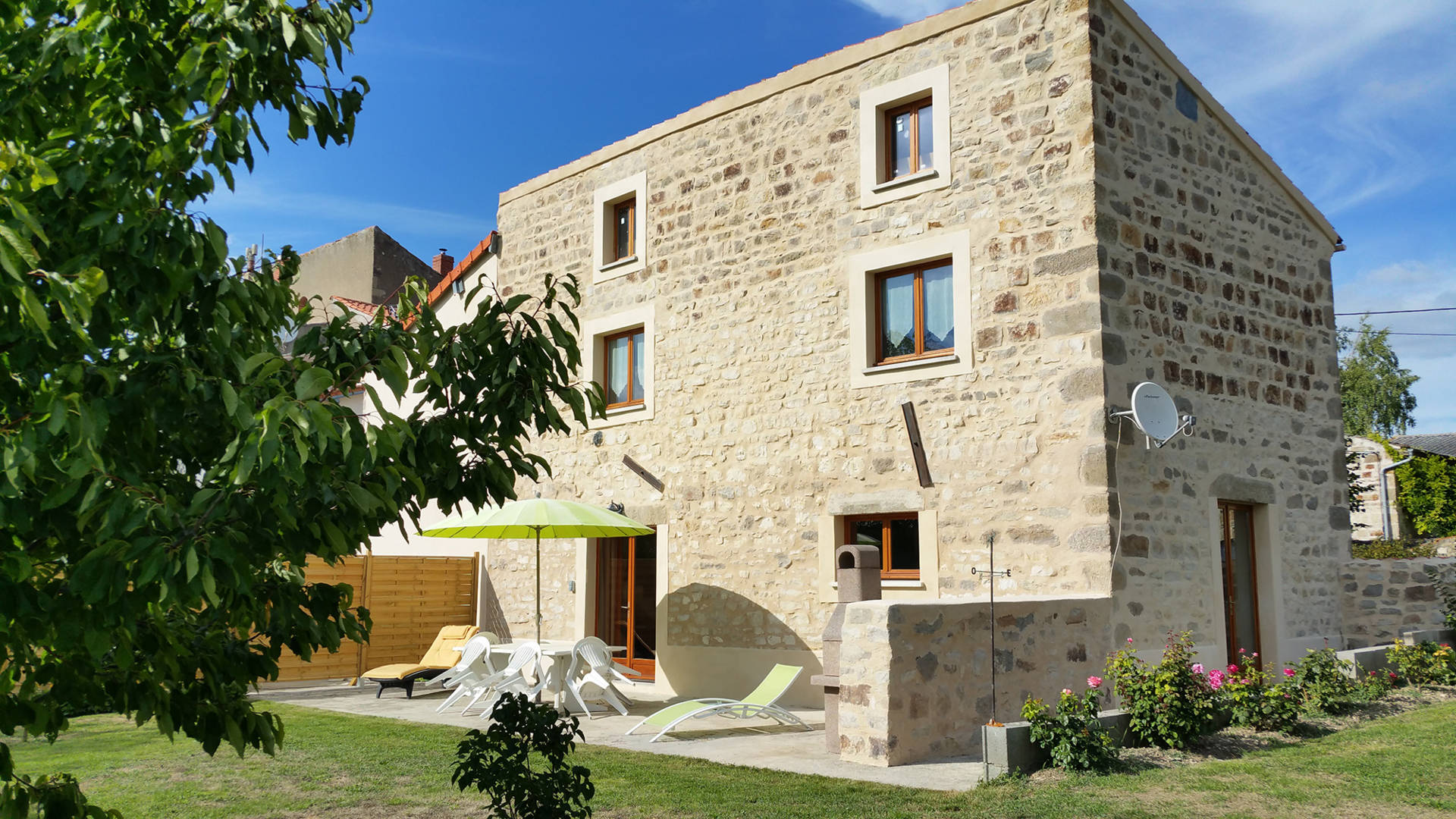 Terrasse 30 m² avec salon de jardin, barbecue, bains de soleil.