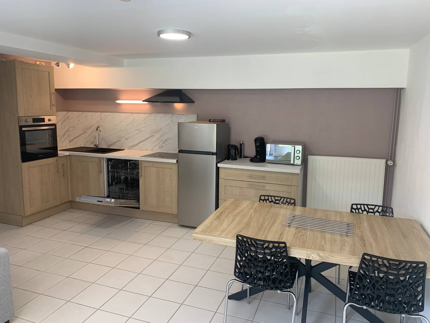 Pièce principale avec coin cuisine ; celle ci est entièrement équipée avec lave-vaisselle, four, four micro-onde, réfrigérateur avec congélateur, cafetière Senseo, plaque induction – la liste de l’équipement complet(…)
