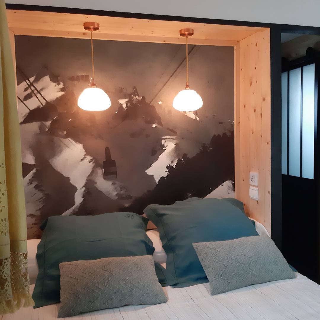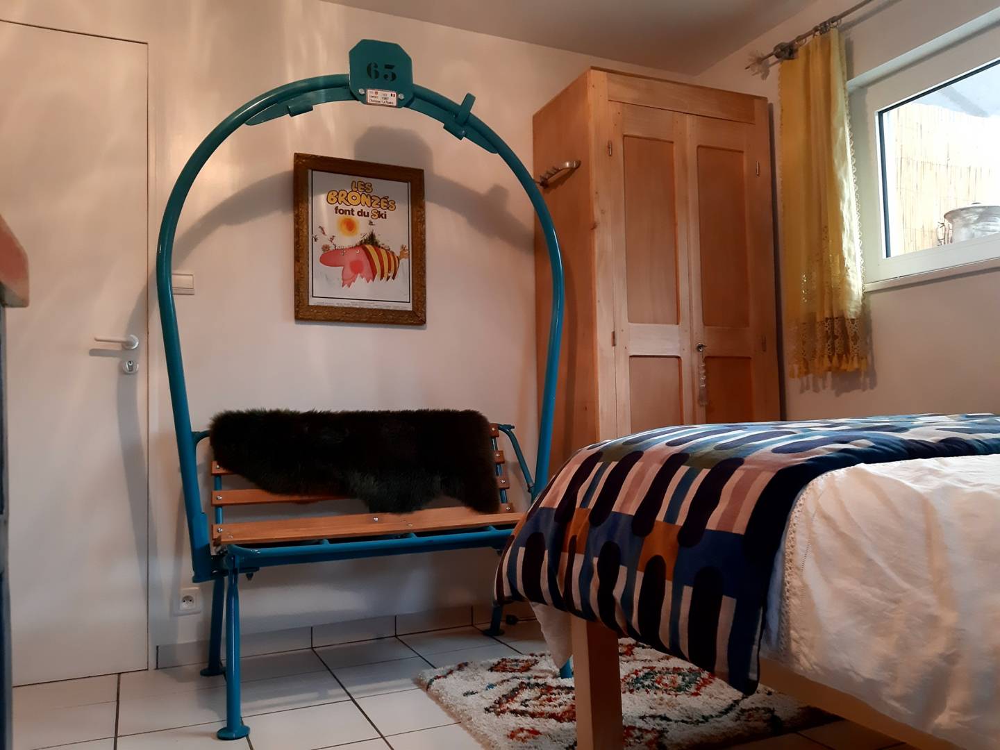. le coin chambre et détente : lit de 140, armoire et… un véritable Télésiège en guise de banquette