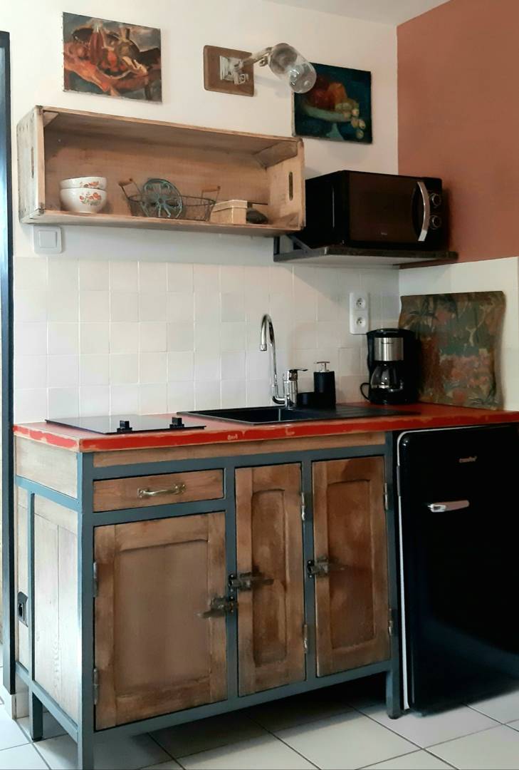 . le coin cuisine avec plaque vitrocéramique, micro-onde, réfrigérateur, placards, table et chaises, vaisselle et produits de 1ère nécessité