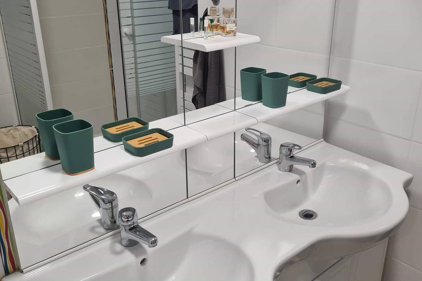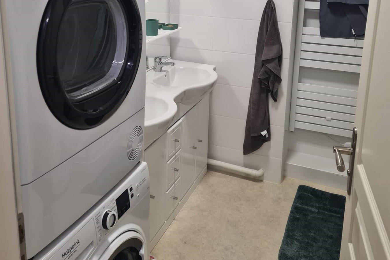 L’appartement dispose d’une agréable salle d’eau avec double vasque, douche, lave-linge et sèche linge.