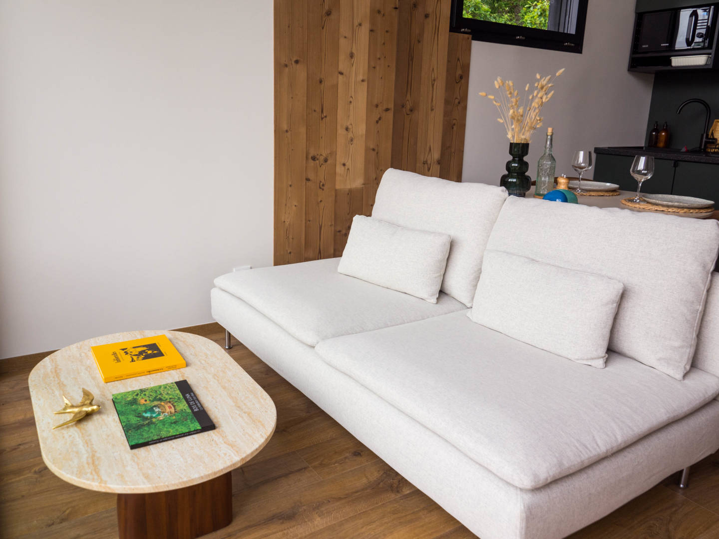 Vous profiterez d’un salon avec coin cuisine, d’une chambre séparée avec lit king size et d’une salle d’eau avec WC.